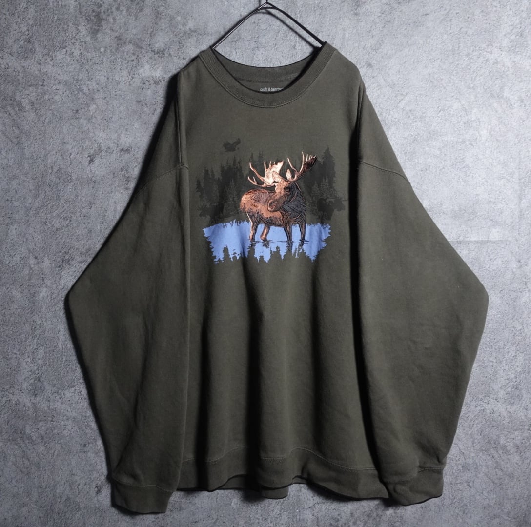カーキをベースにブラウンのヘラジカの刺繍と、背景に湖、森のプリントを前面の中心部分にあしらったデザイン。