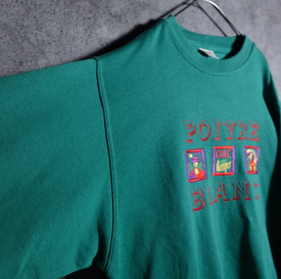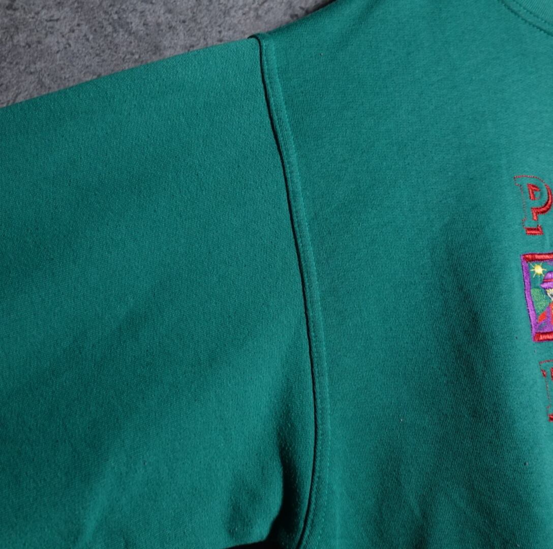 グリーンをベースにレッド、パープル、イエローのアルファベット、人、太陽などの刺繍を前面に施したデザイン。