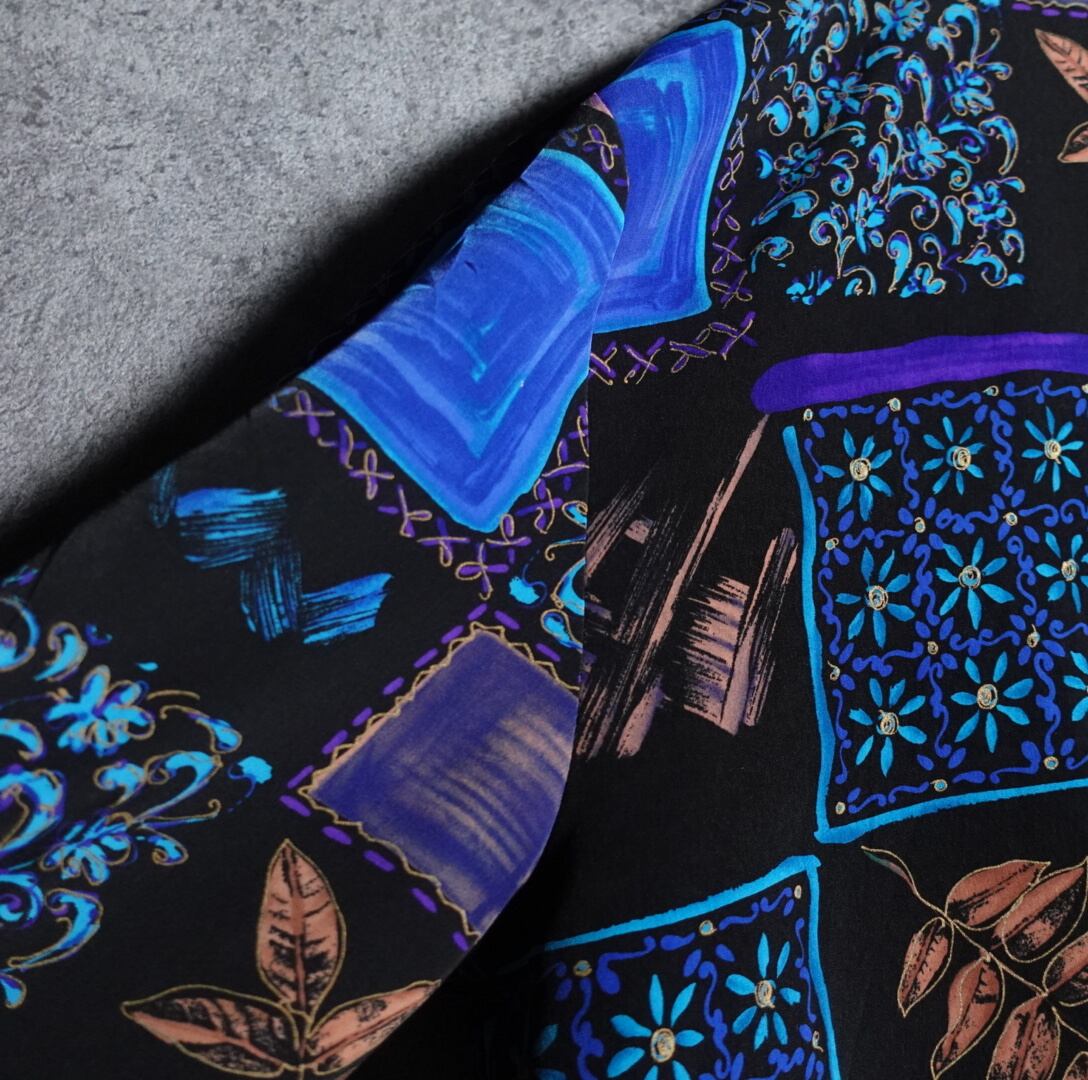 ブラックをベースに花柄、ボタニカルモチーフ、幾何学を全面にあしらったデザイン。