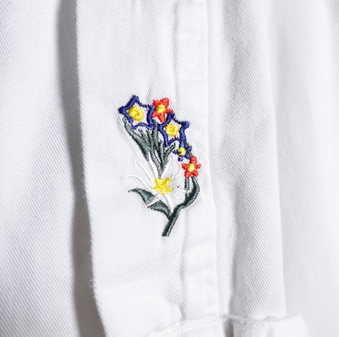 ボトムスはホワイトベースなので、刺繍の色を拾ったカラースラックスは勿論、デニムパンツと合わせていただくのもおすすめです。