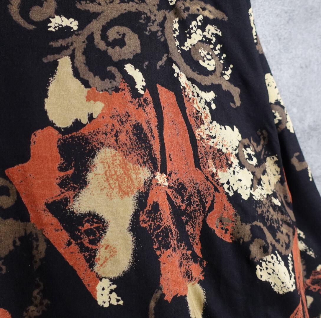 ブラックをベースにオレンジ、ベージュの抽象的な柄を全面にあしらったアーティスティックなデザイン。