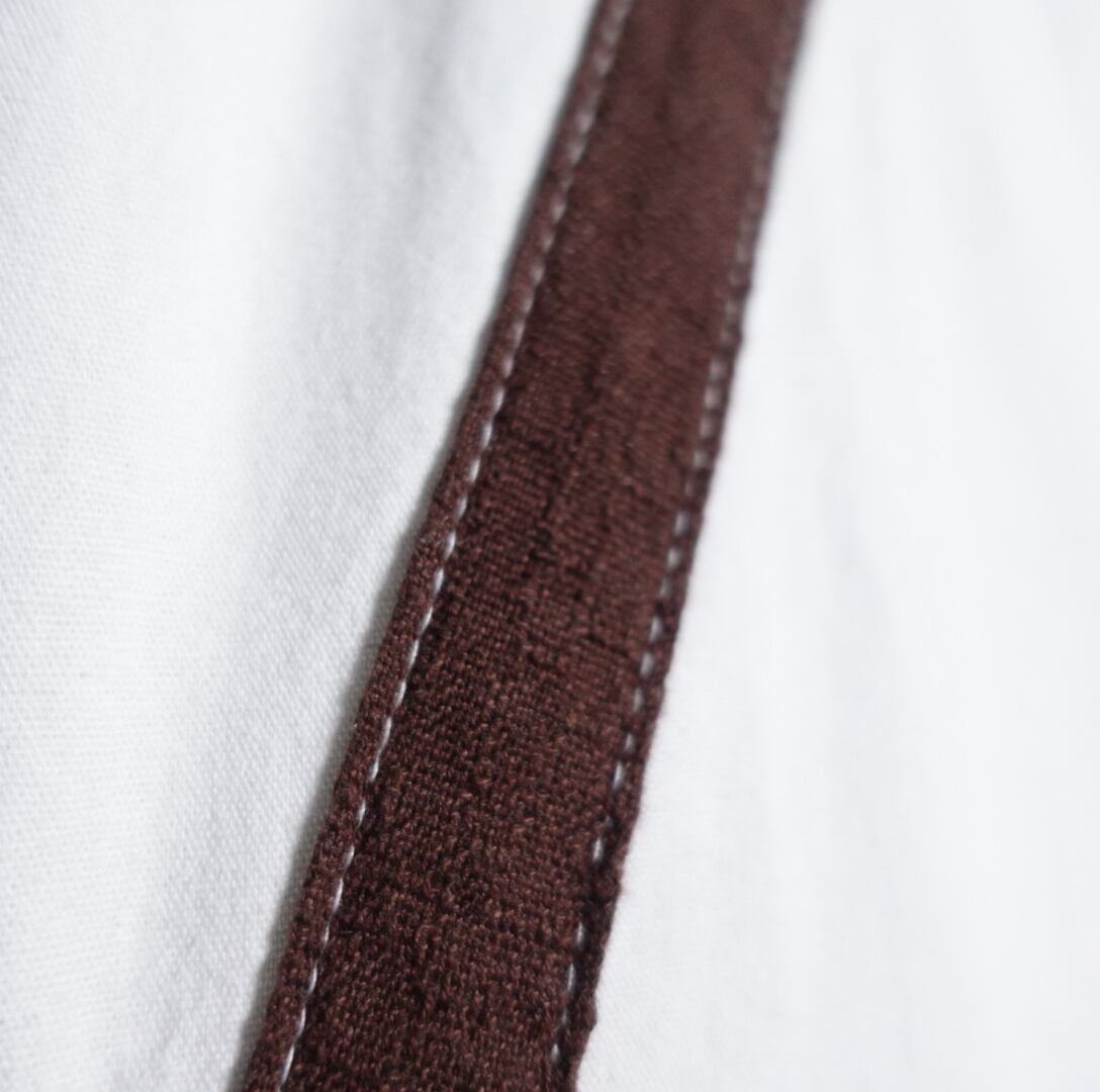 ホワイトをベースにアイボリーの抽象的な柄とベルトモチーフの刺繍を両面に施したデザイン。