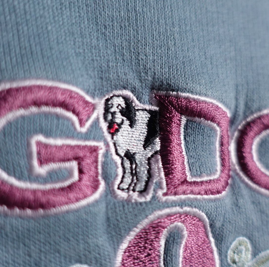 マリンブルーのような独特な色味をベースに、BIG DOG MUST OBEY MEのピンク刺繍を施したデザイン。
