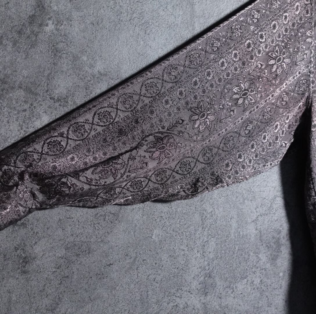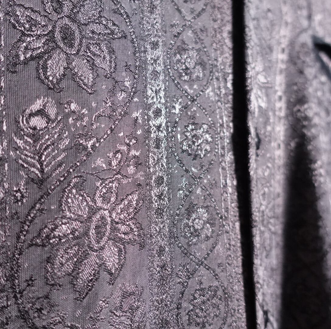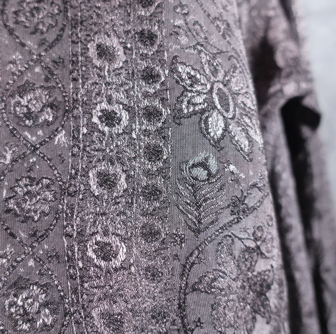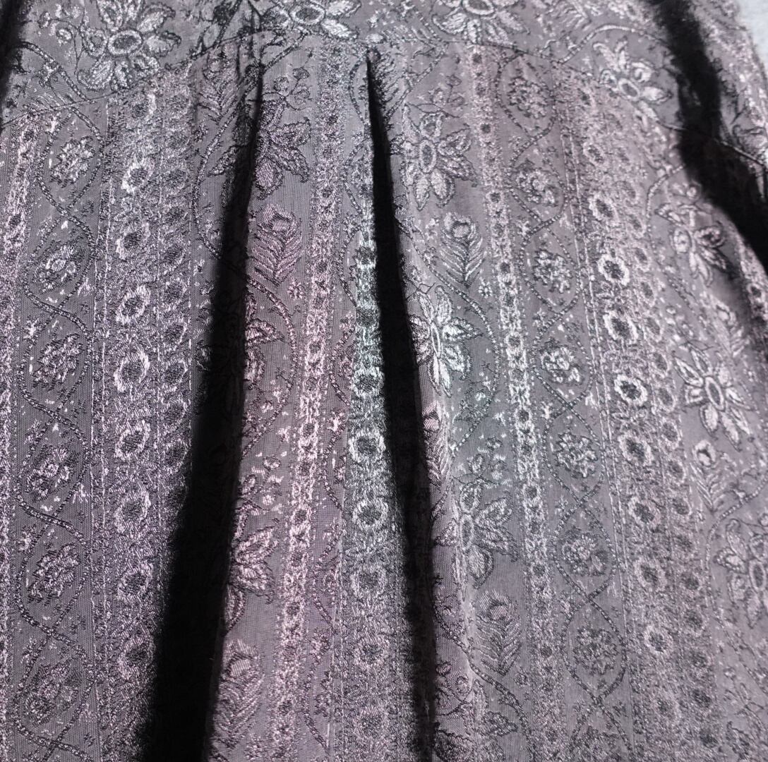 パープルをベースに光沢感のある花柄、抽象的な柄の刺繍をストライプ状に全面に施したデザイン。