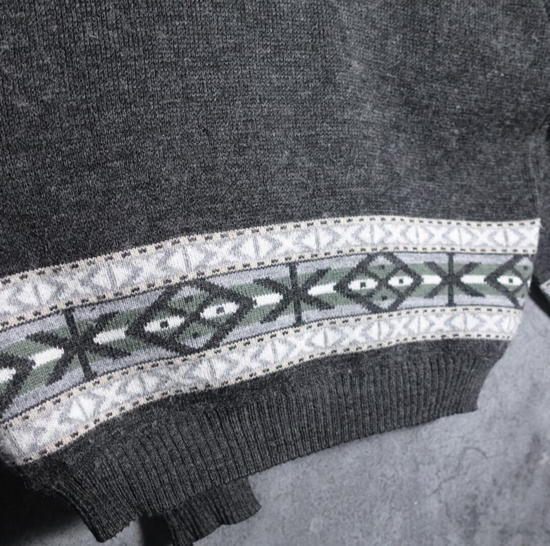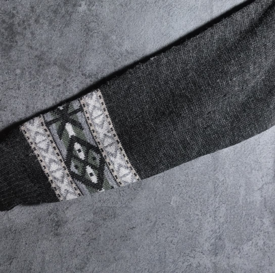 ダークグレーをベースに袖、裾付近にホワイト、グレー、グリーン、ブラックの抽象的な柄を施したユーロらしい洒落たデザイン。