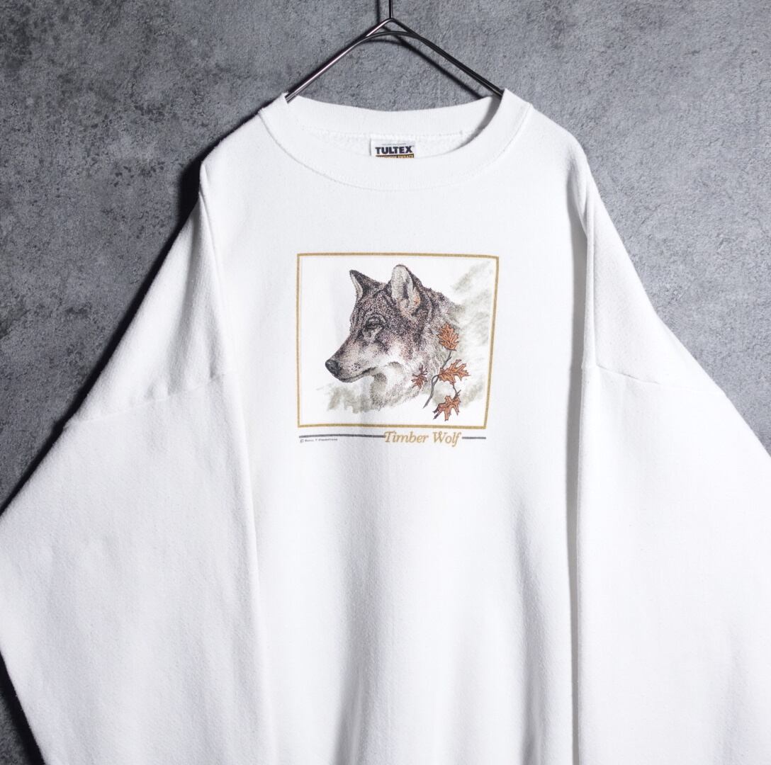 90s"TULTEX" White Animal Wolf Print Sweat