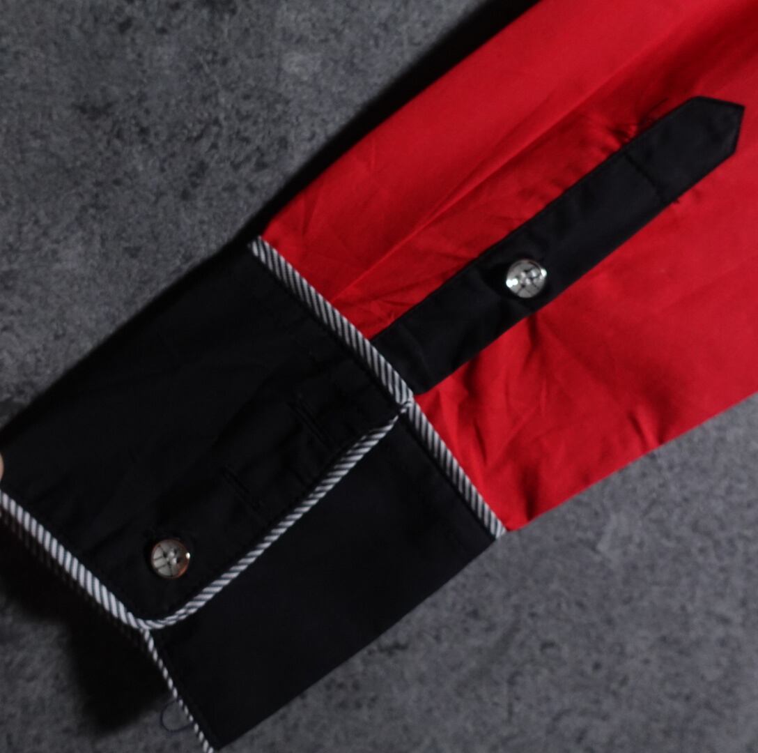 レッドをベースに袖先、胸をブラックに切り替え、中にレッドの抽象的な柄の刺繍を施した豪華なデザイン。