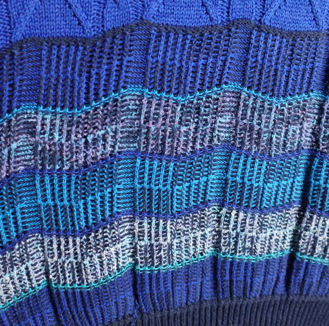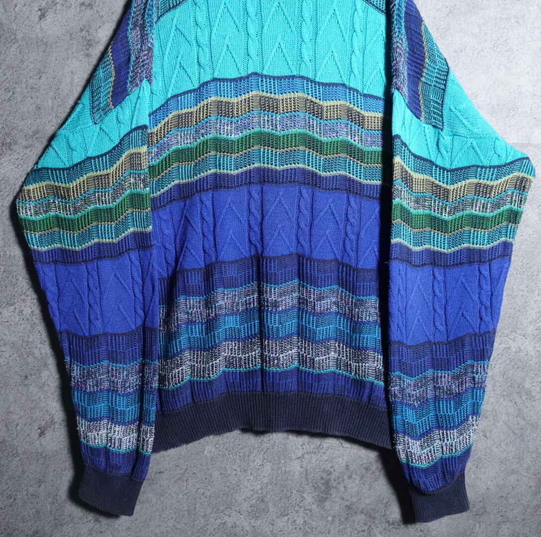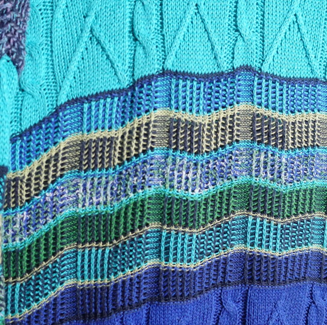 カラーごとのジグザグな編みとケーブル編みをボーダー状に仕上げた立体感のある洒落たデザイン。