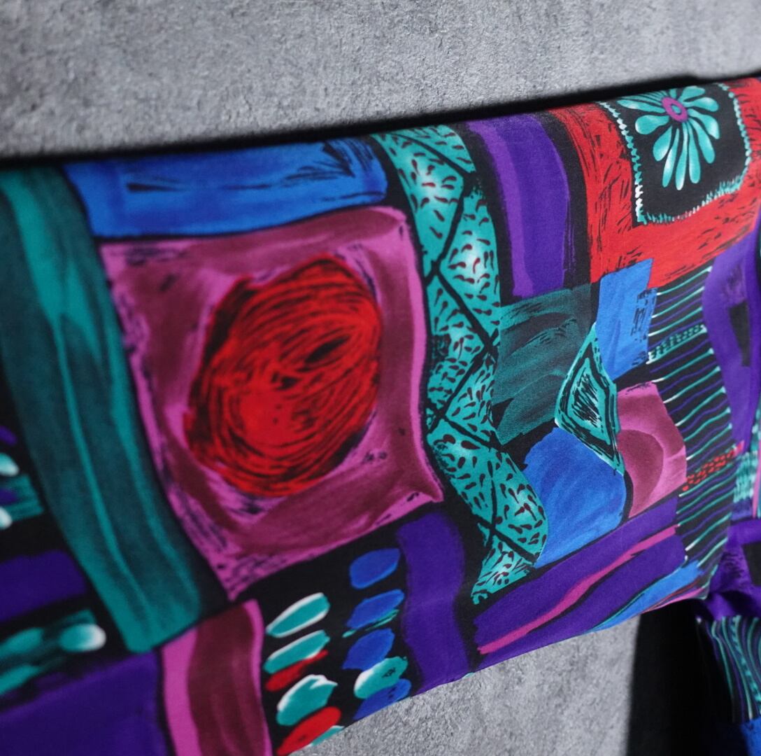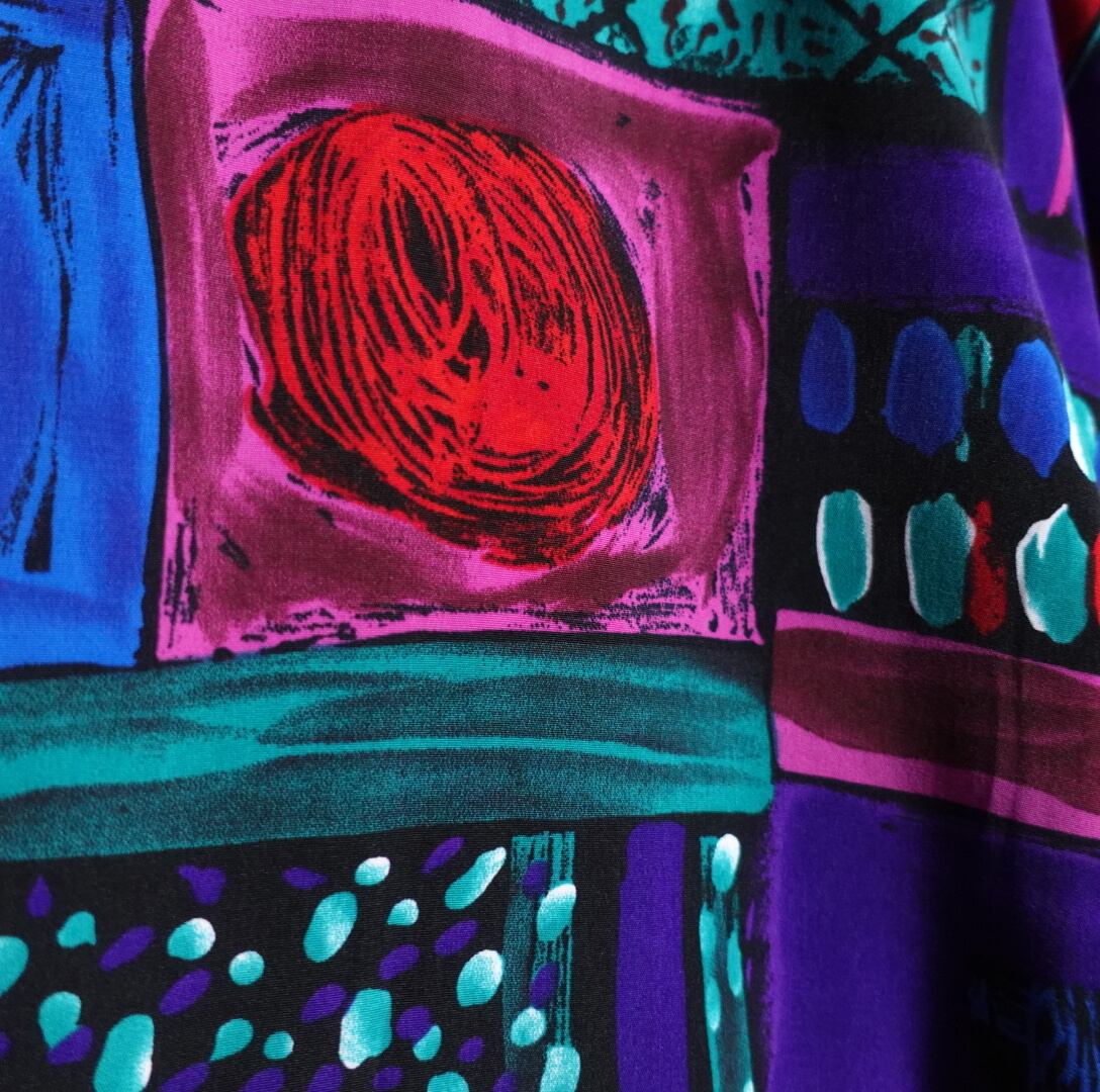 様々な抽象的なモチーフや柄をバラバラに全面にあしらったアーティスティックなデザイン。