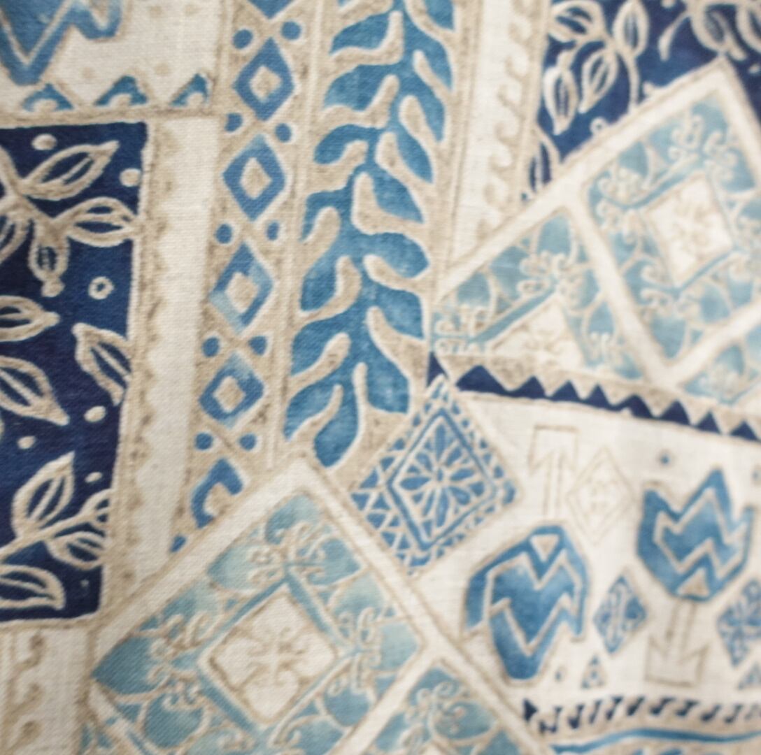 アイボリーをベースにネイビー、ライトブルーの幾何学模様を全面にあしらったデザイン。