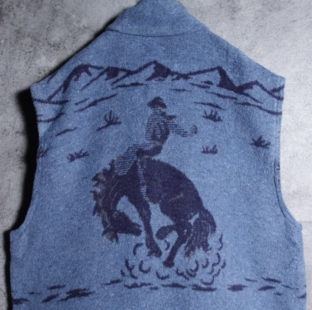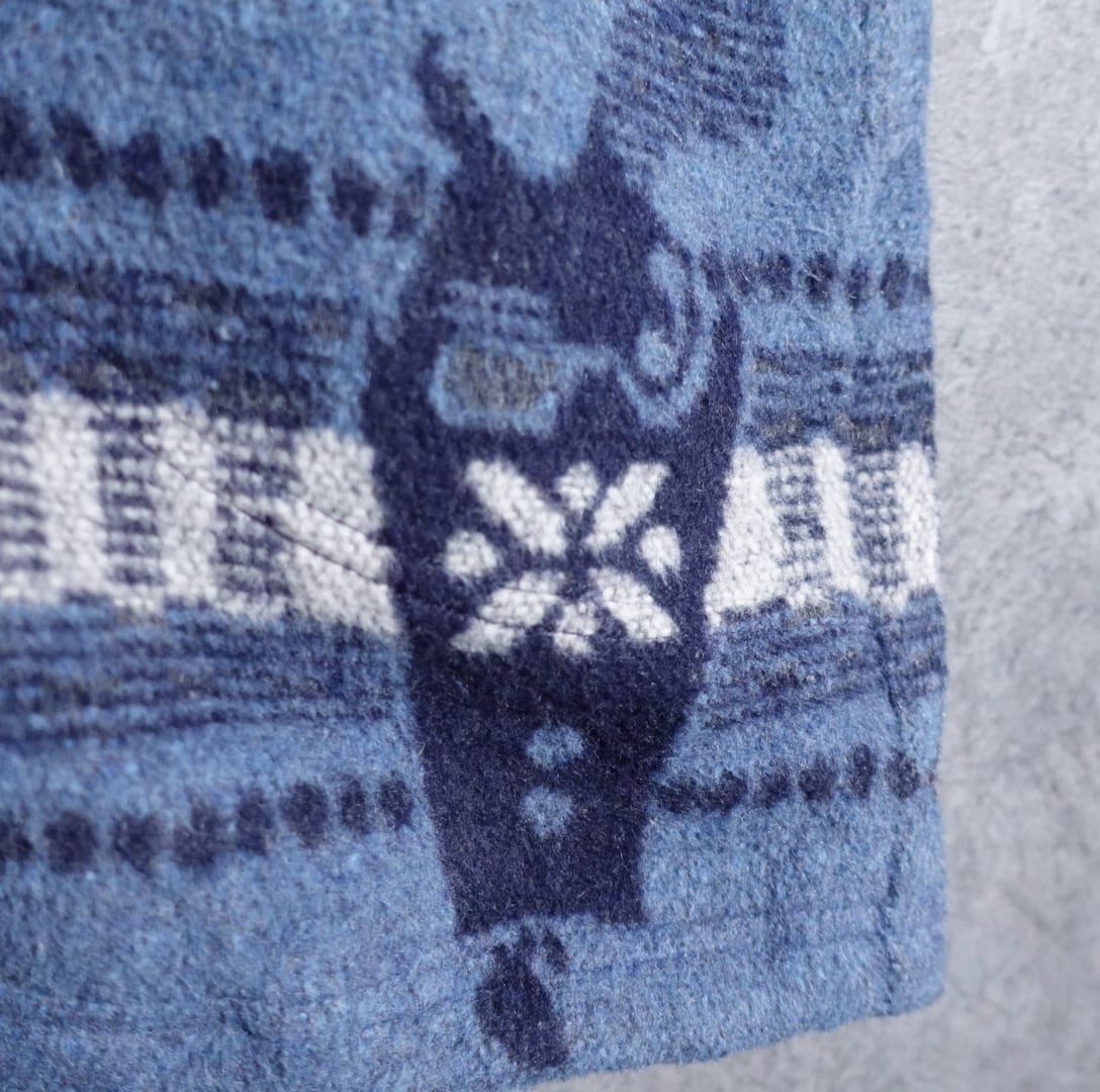 ブルーをベースに乗馬をしている様子を表現し、裾にはネイティブ調の柄をあしらったデザイン。