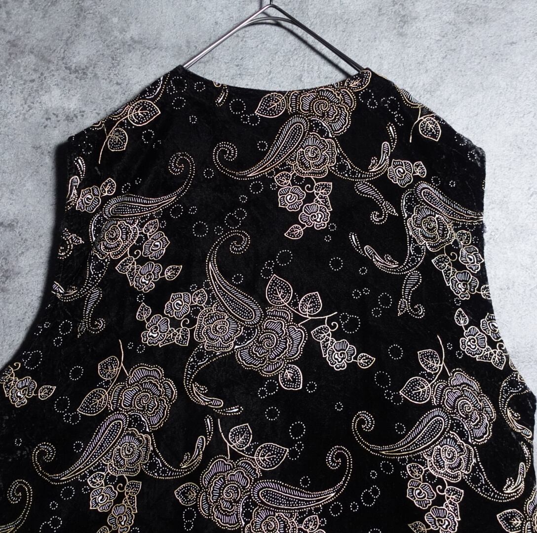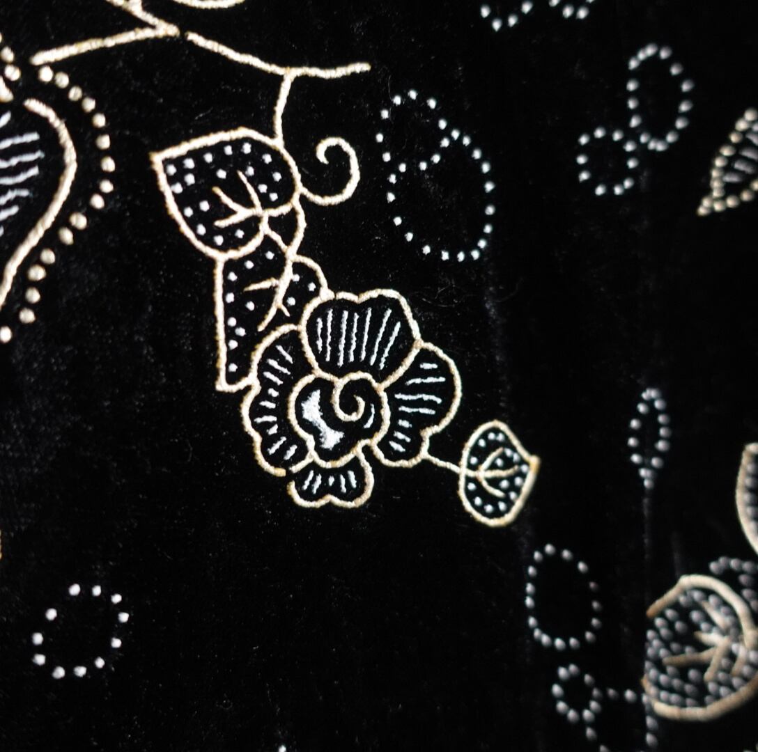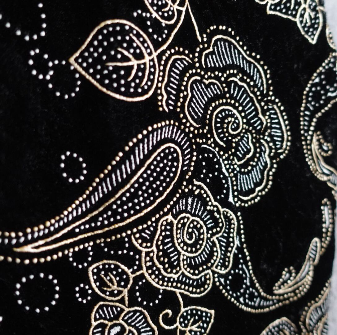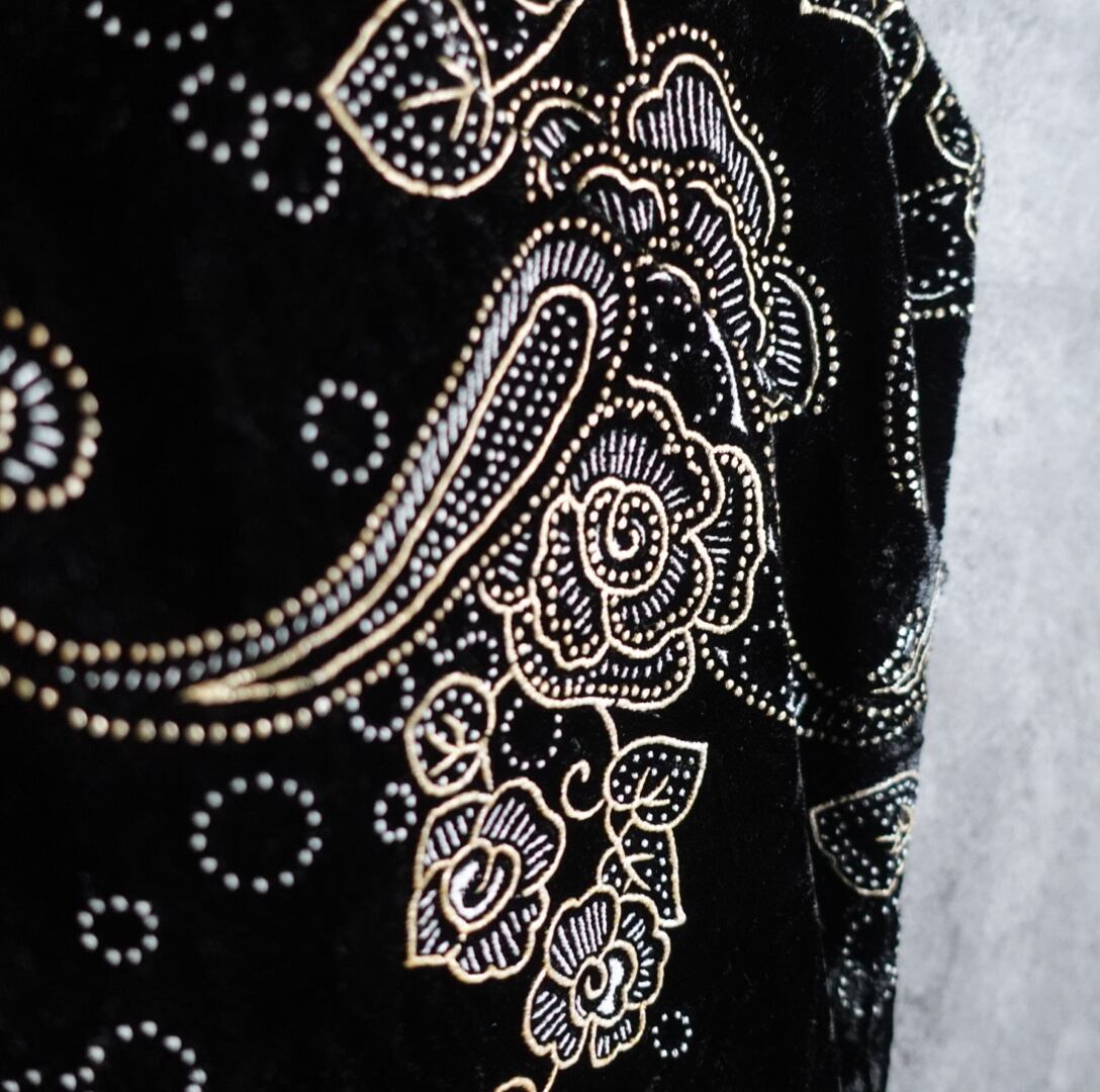 ブラックのベロア生地をベースにゴールドのペイズリー&フラワーのモチーフ刺繍を全面に施したラグジュアリーな雰囲気のあるデザイン。
