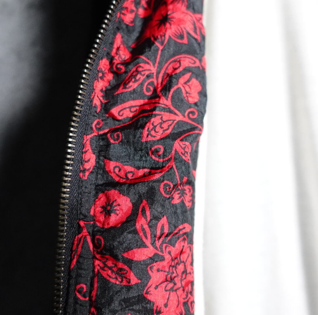 ブラックをベースにレッドの花柄モチーフの刺繍を前面に施したデザイン。