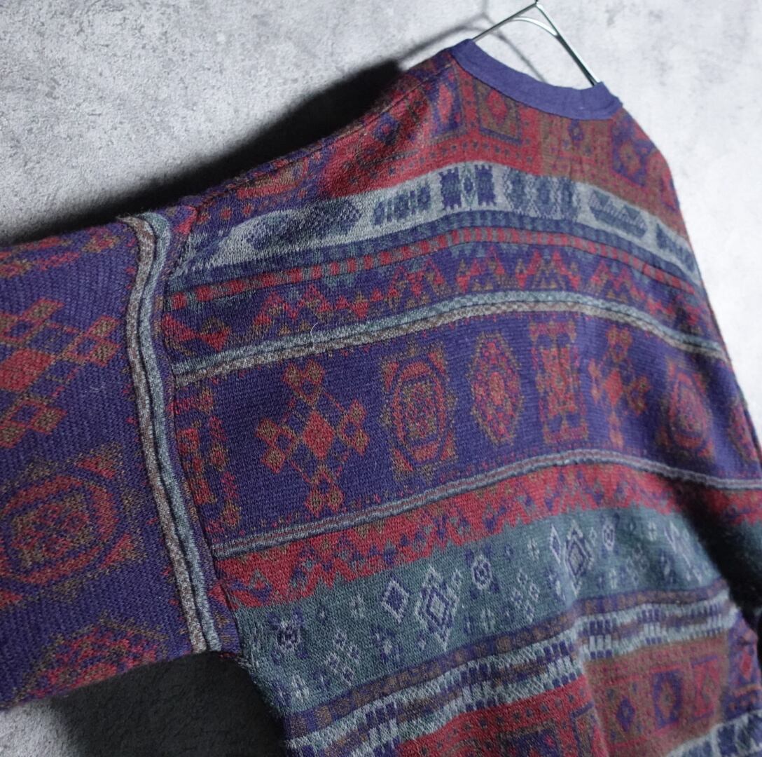 様々な幾何学模様をボーダー状に全面にあしらったアーティスティックなデザイン。