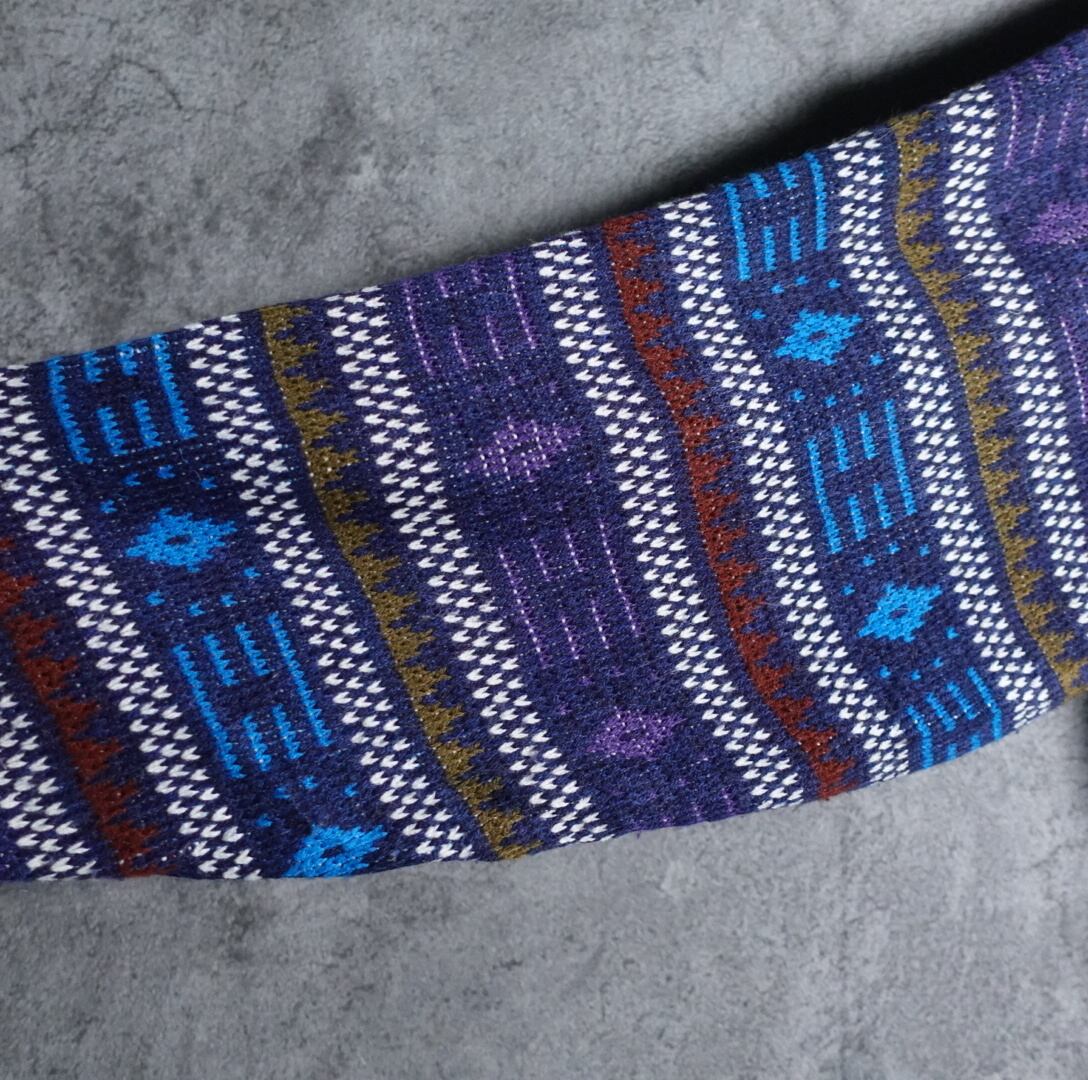 ネイビー、ホワイト、パープル、ブルー、燻んだゴールド、ワインレッドの鮮やかなマルチカラーリング。