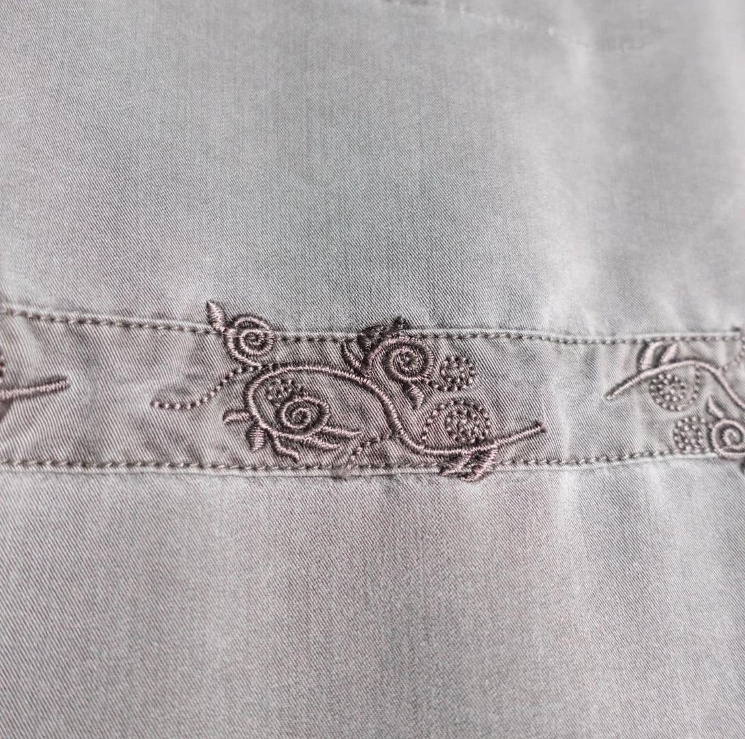 胸元、裾、背面に別生地と花のモチーフ刺繍を施した凝りに凝ったスペシャルなデザイン。