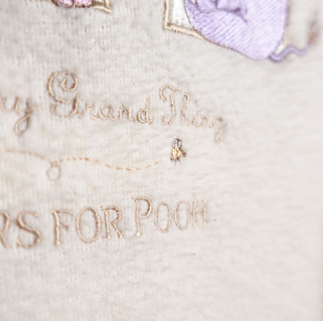 アイボリーをベースに中央にティガー、プーさん、イーヨー、ピグレッドの刺繍を施した心温まる可愛らしいデザイン。
