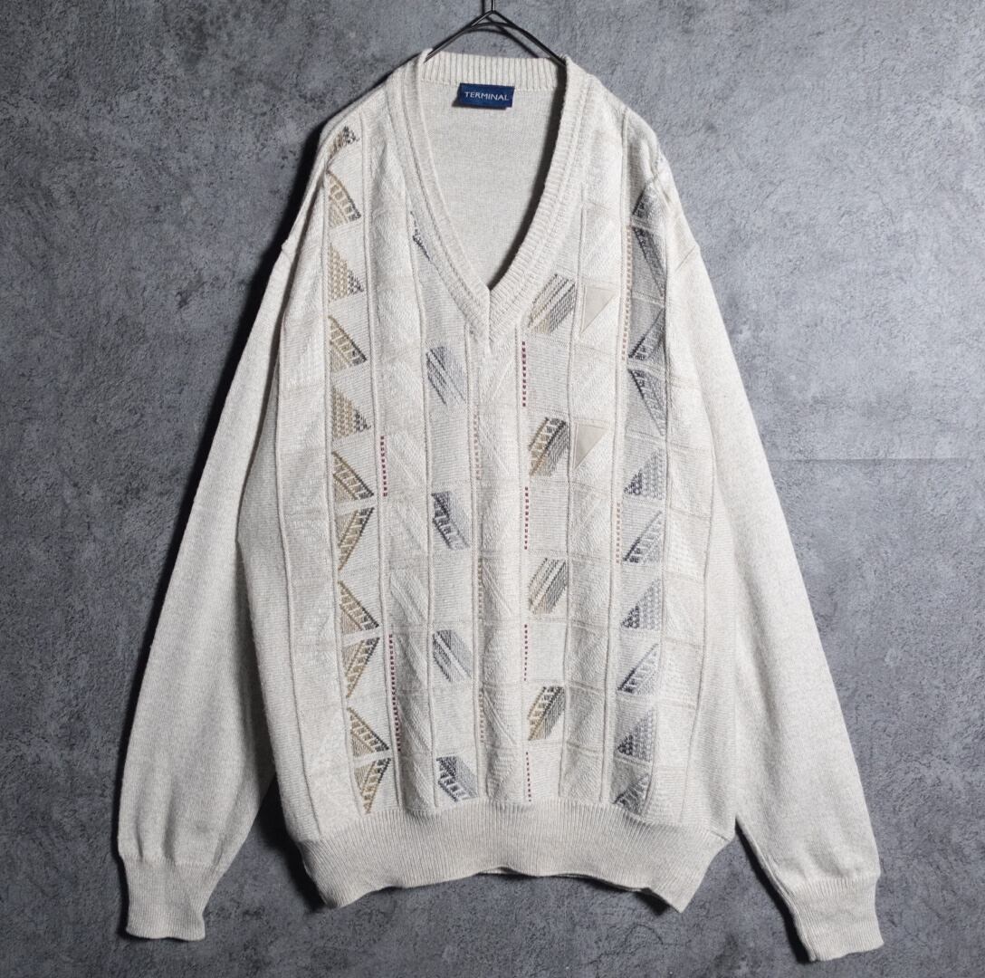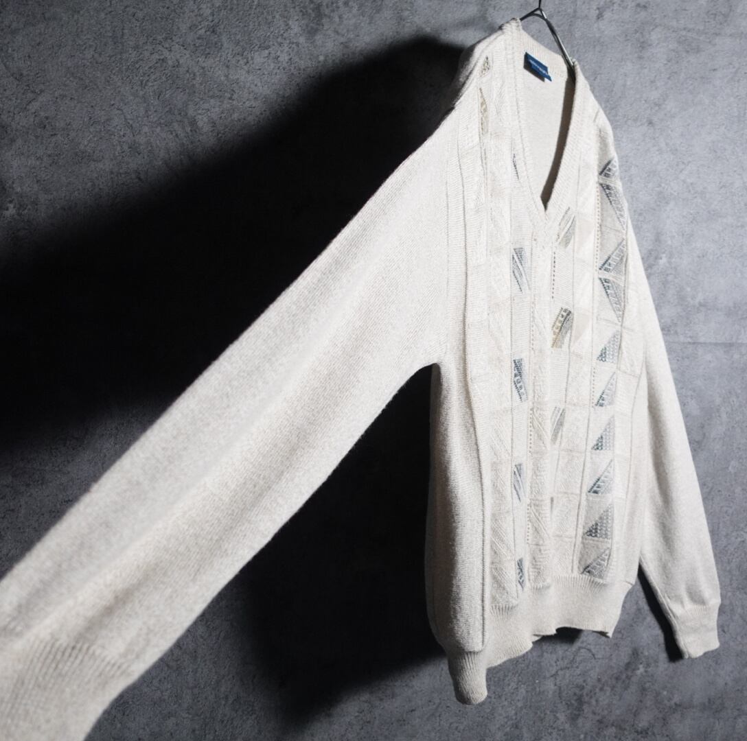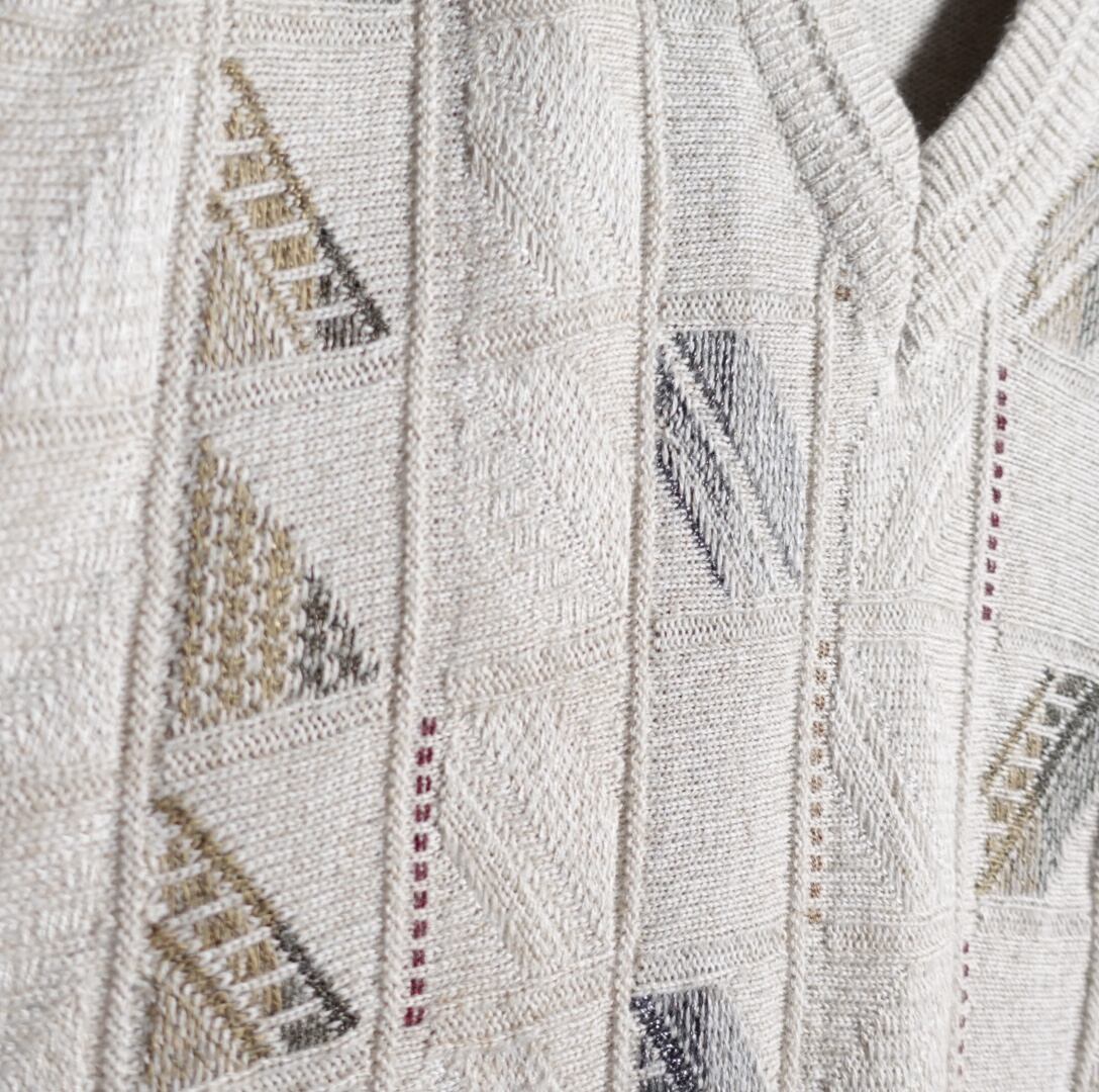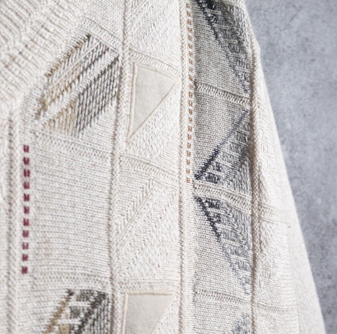 ユーロの幾何学モチーフのデザインVネックニットが入荷です。