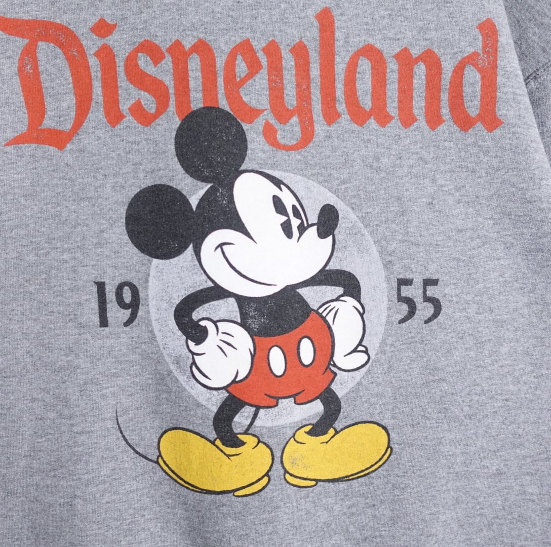 グレーをベースにミッキーとレッドのアルファベットプリントを前面の中心部分にあしらった90年代らしいレトロなデザイン。