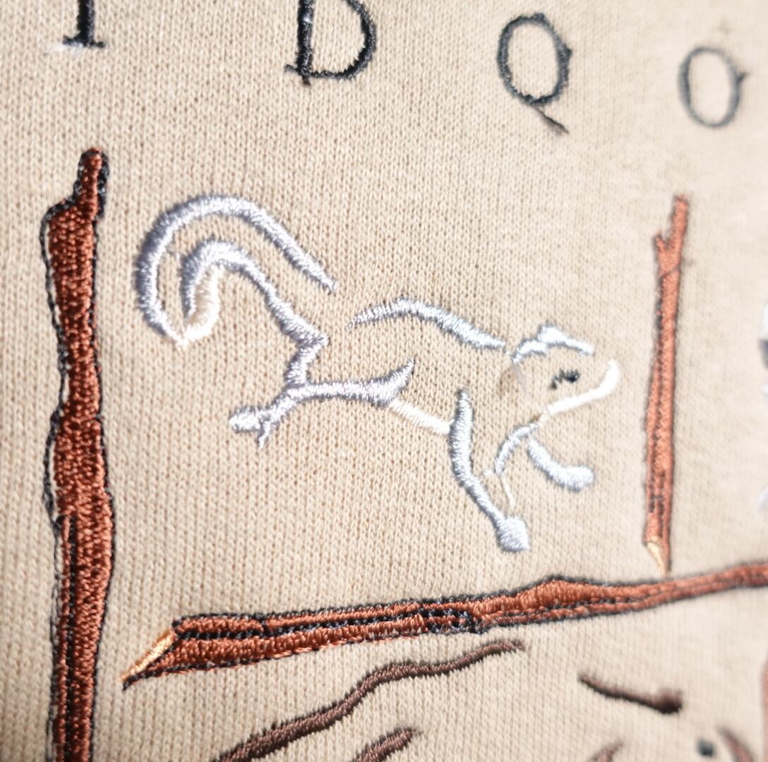 ベージュをベースにキツネ、クマ、ウサギ、エルクなどのアニマルとアルファベット刺繍を施した凝ったデザイン。