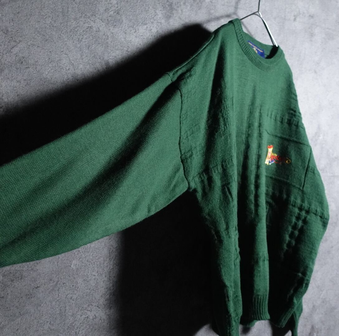 グリーンをベースにレッド、イエロー、ブルーの精巧なロゴ刺繍を施したワンポイントデザイン。