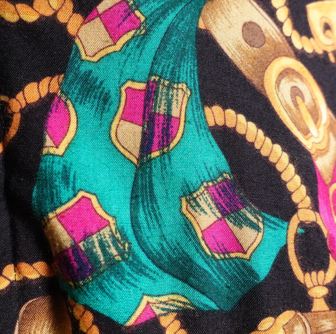 ベルト、チェーンなどの様々な装飾のモチーフを全面にあしらったインパンクトのあるスカーフ調のデザイン。