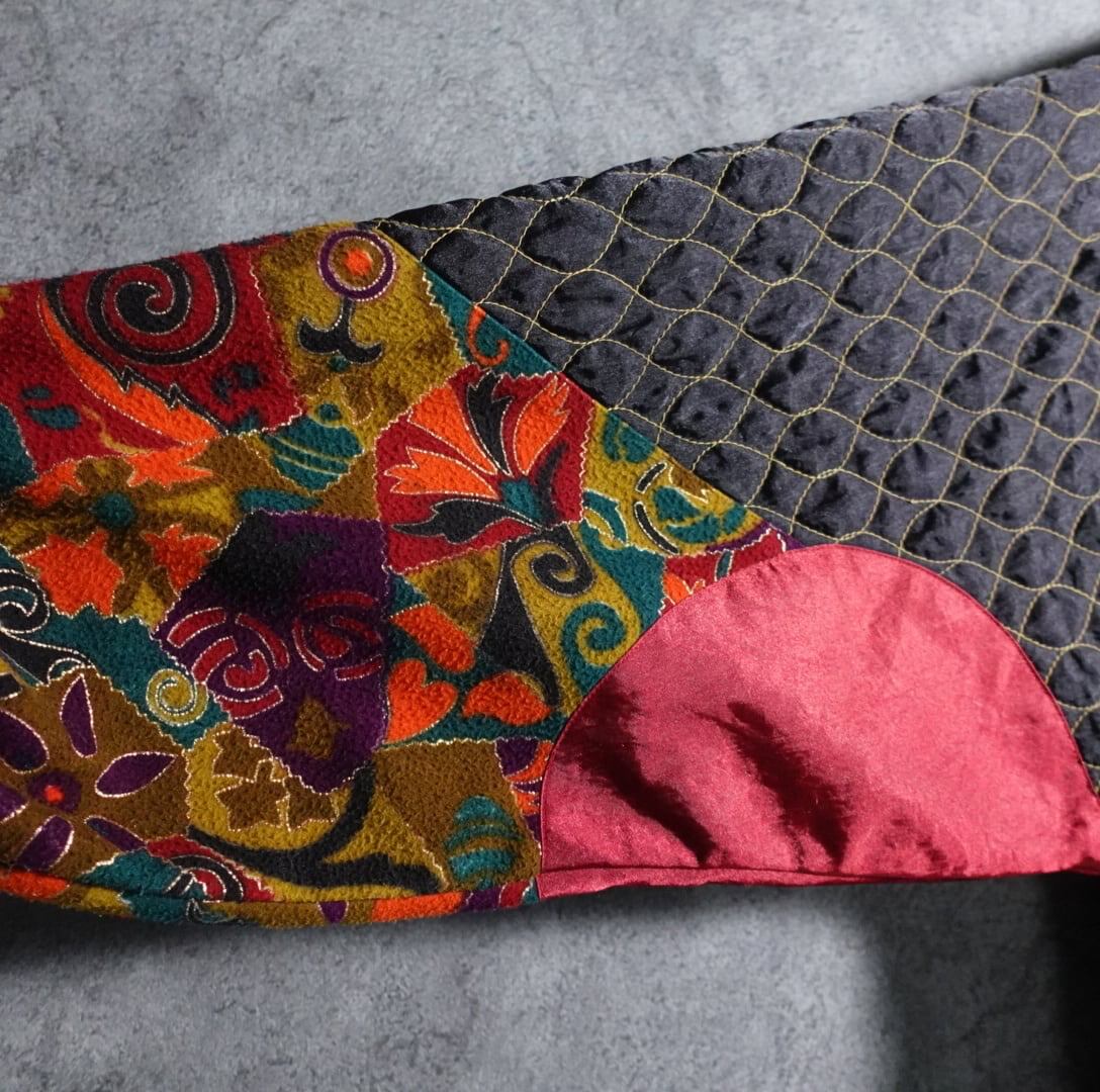 無地のグリーン、ワインレッドとキルティング、幾何学模様の柄をあしらったフリース生地をパッチワーク状に施したスペシャルなデザイン。