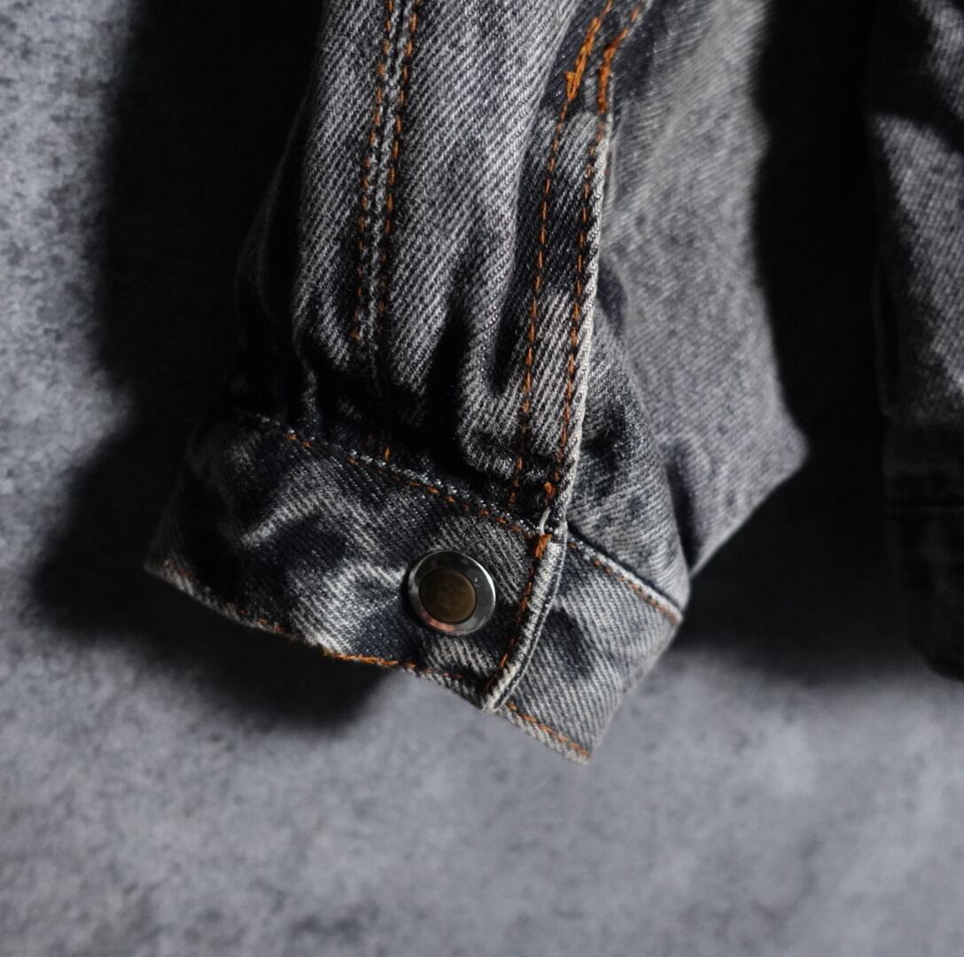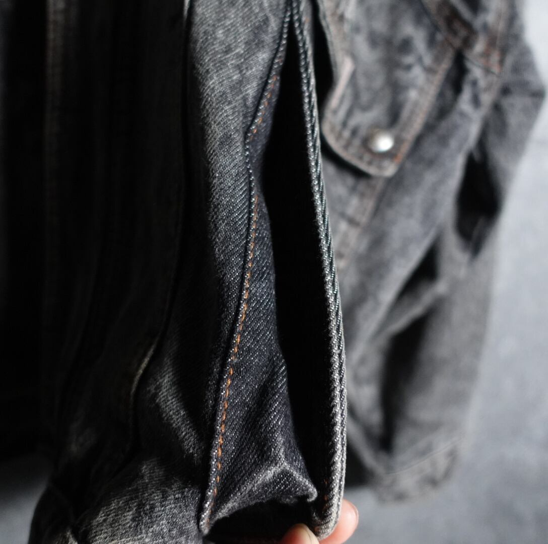 ブラックデニムをベースに両胸にマチのある大きなポケットや比翼を施したデザイン。