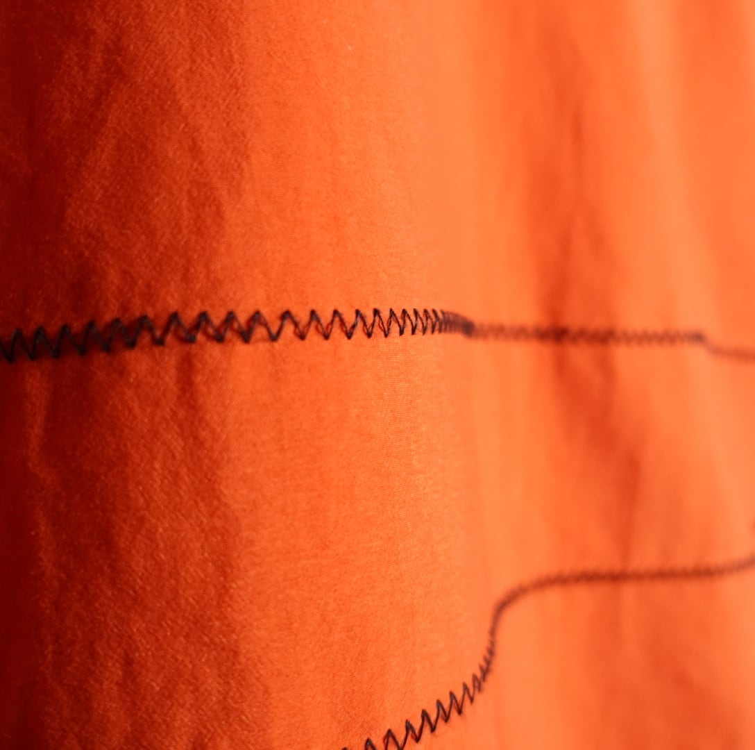 発色の良いオレンジをベースに、左胸にブラックの猫とアルファベット刺繍を施したデザイン。