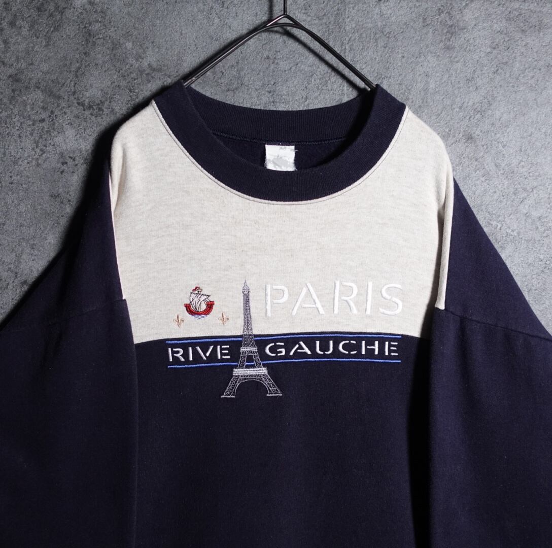 ネイビーとアイボリーをベースに、船、エッフェル塔とPARISのアルファベット刺繍を施したデザイン。