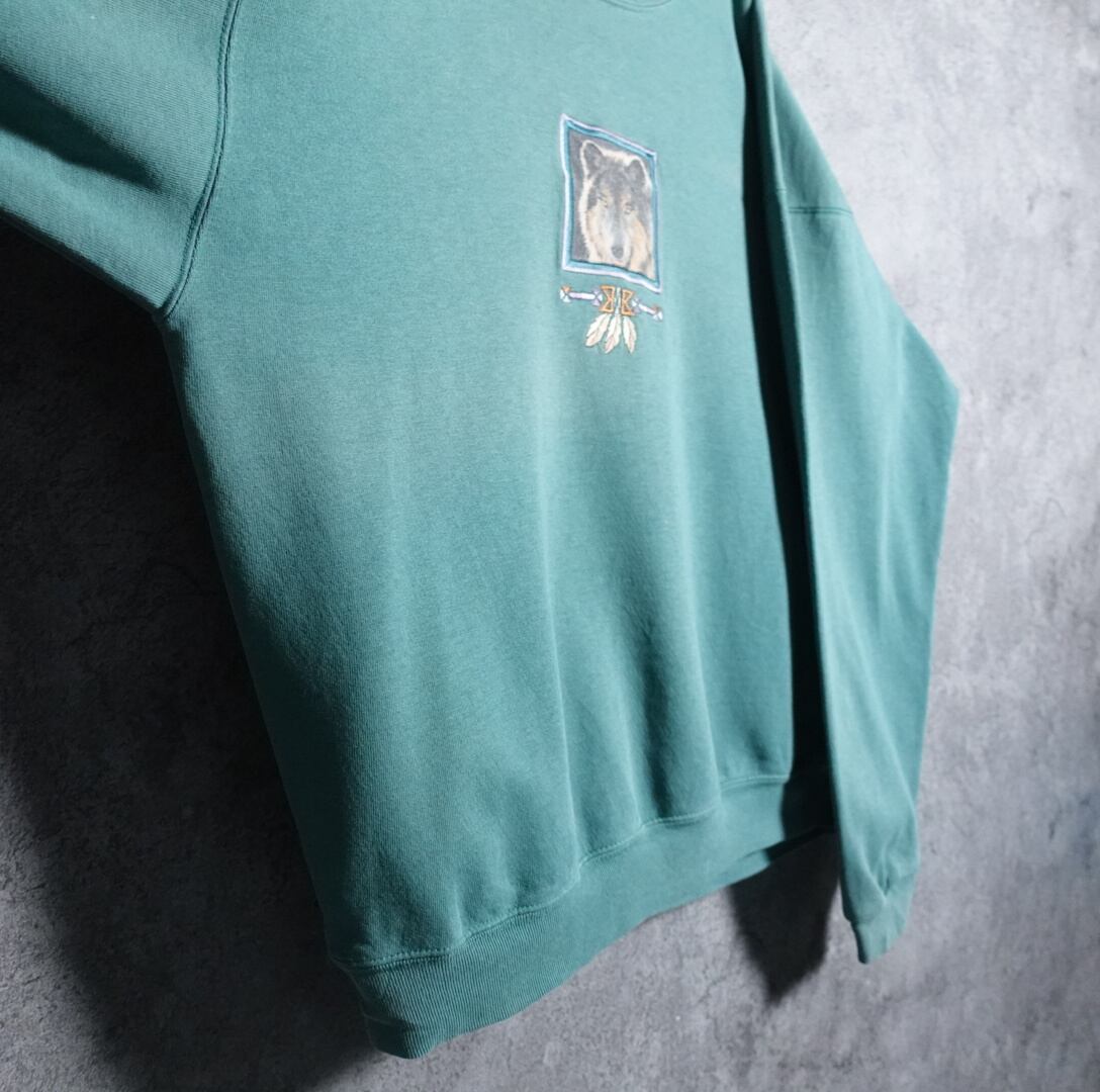 アメリカ製のグリーンオオカミアニマル刺繍スウェットが入荷です。