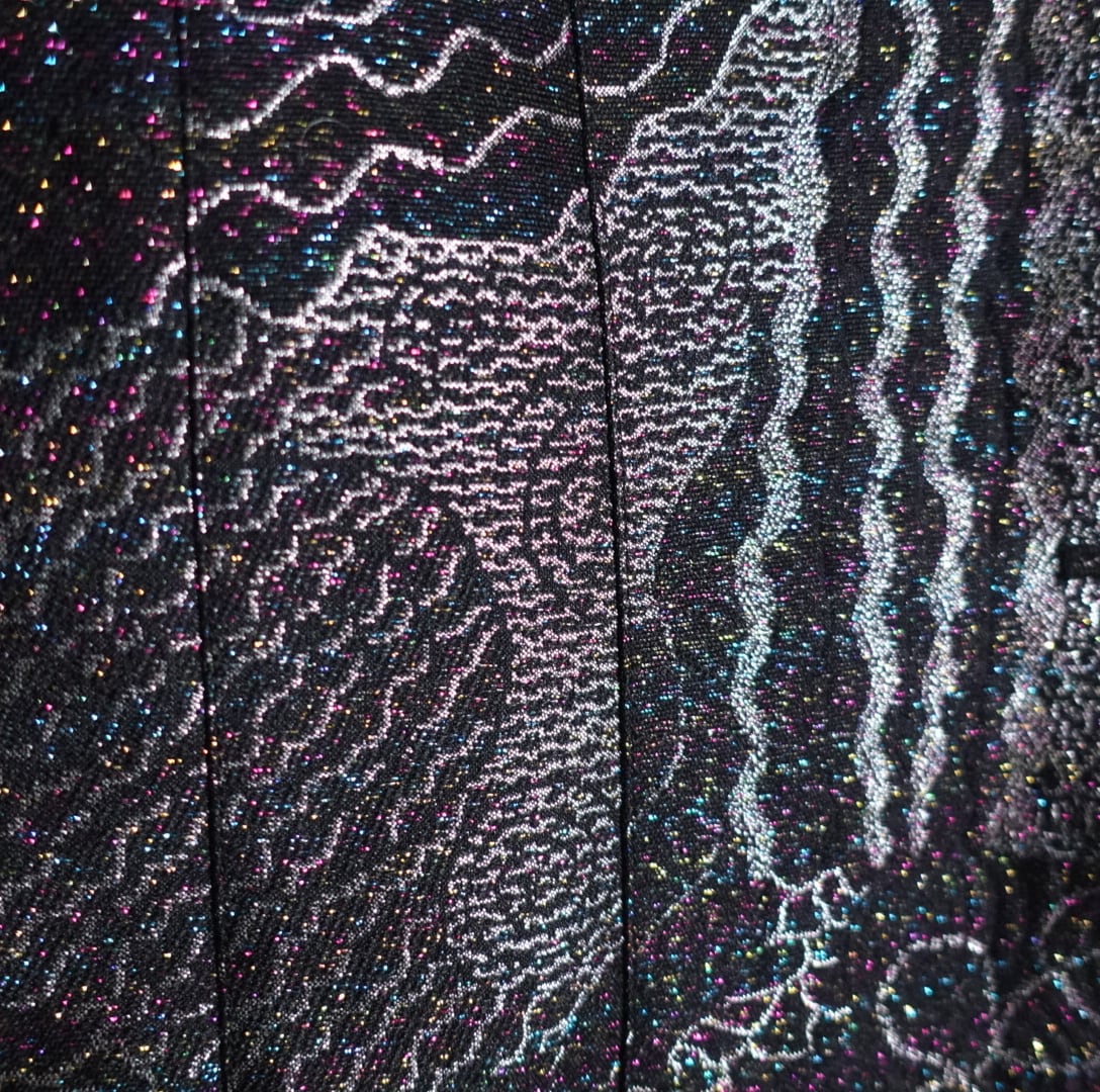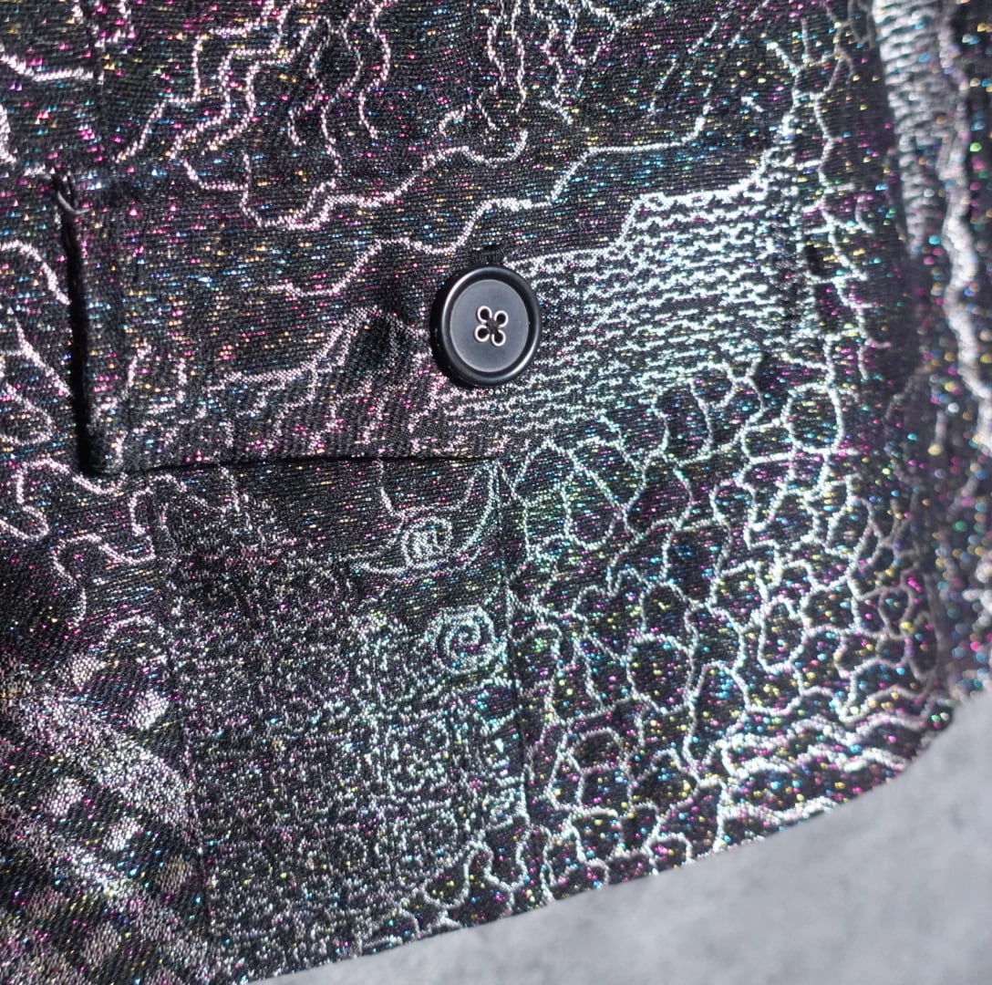 素材はポリエステル、コットン、メタリックで光沢感のある生地感で裏地付きなので今の季節にぴったりです。