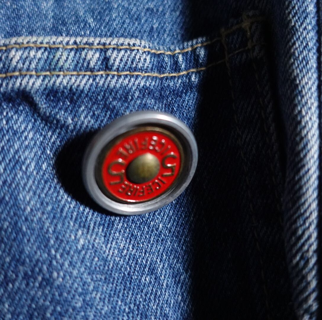 右胸にレッドに燻んだゴールドのデザインを施したシルバーのバッチが良いアクセントになっています。