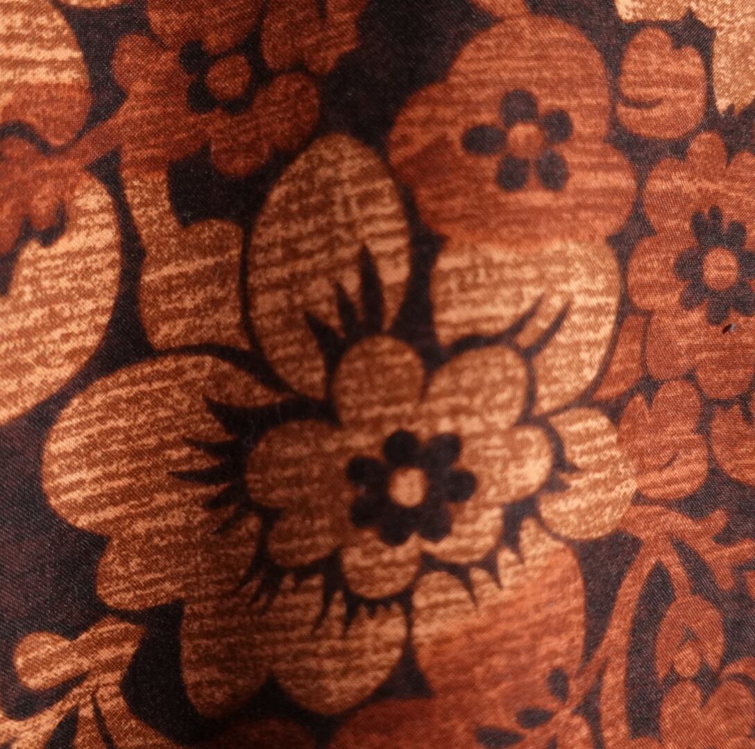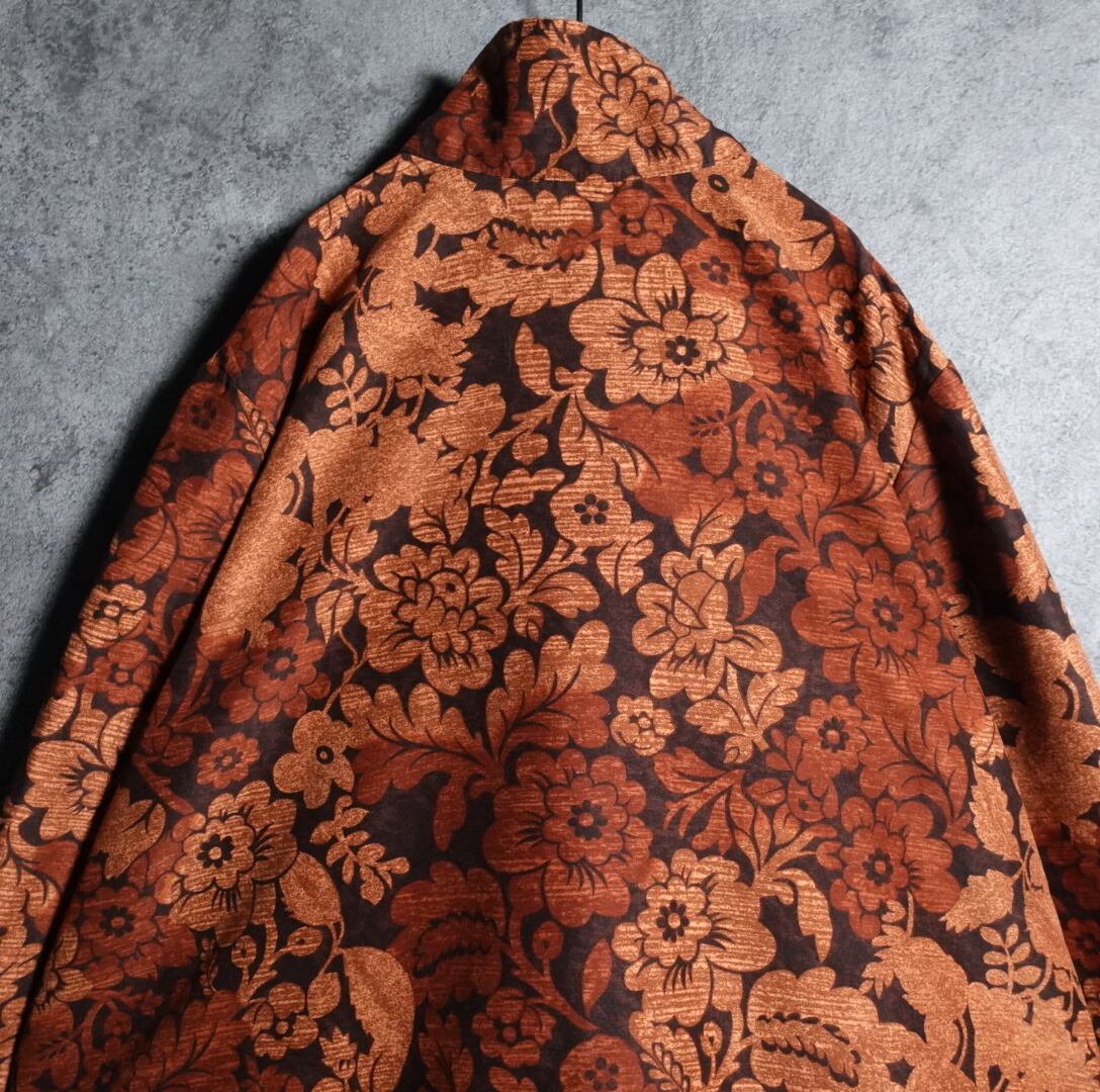 ブラウンをベースに様々なフラワーモチーフを全面にあしらったデザイン。