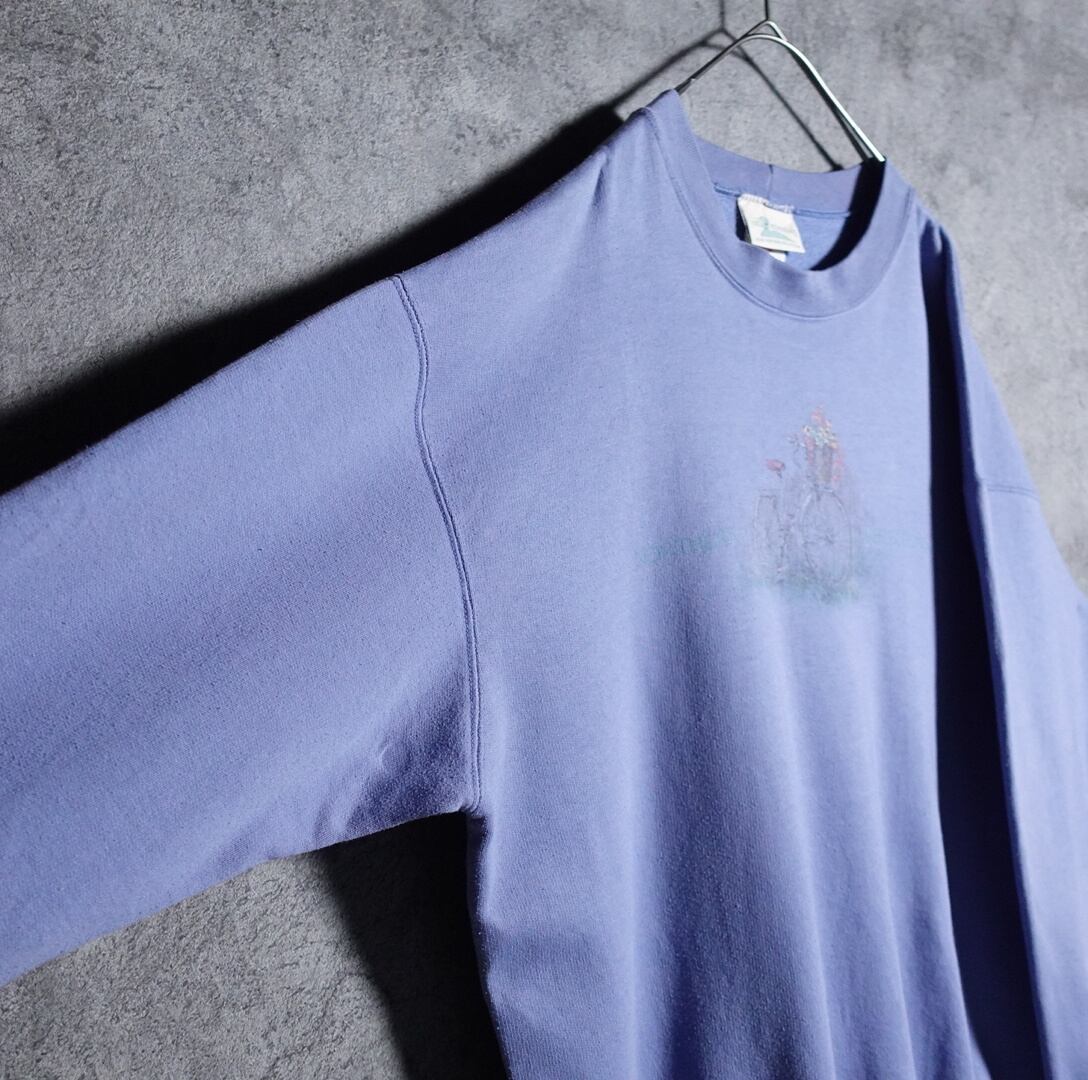 スカイブルーをベースに、一台の自転車のカゴに様々な花を摘んでいるプリント、アルファベットをあしらったデザイン。