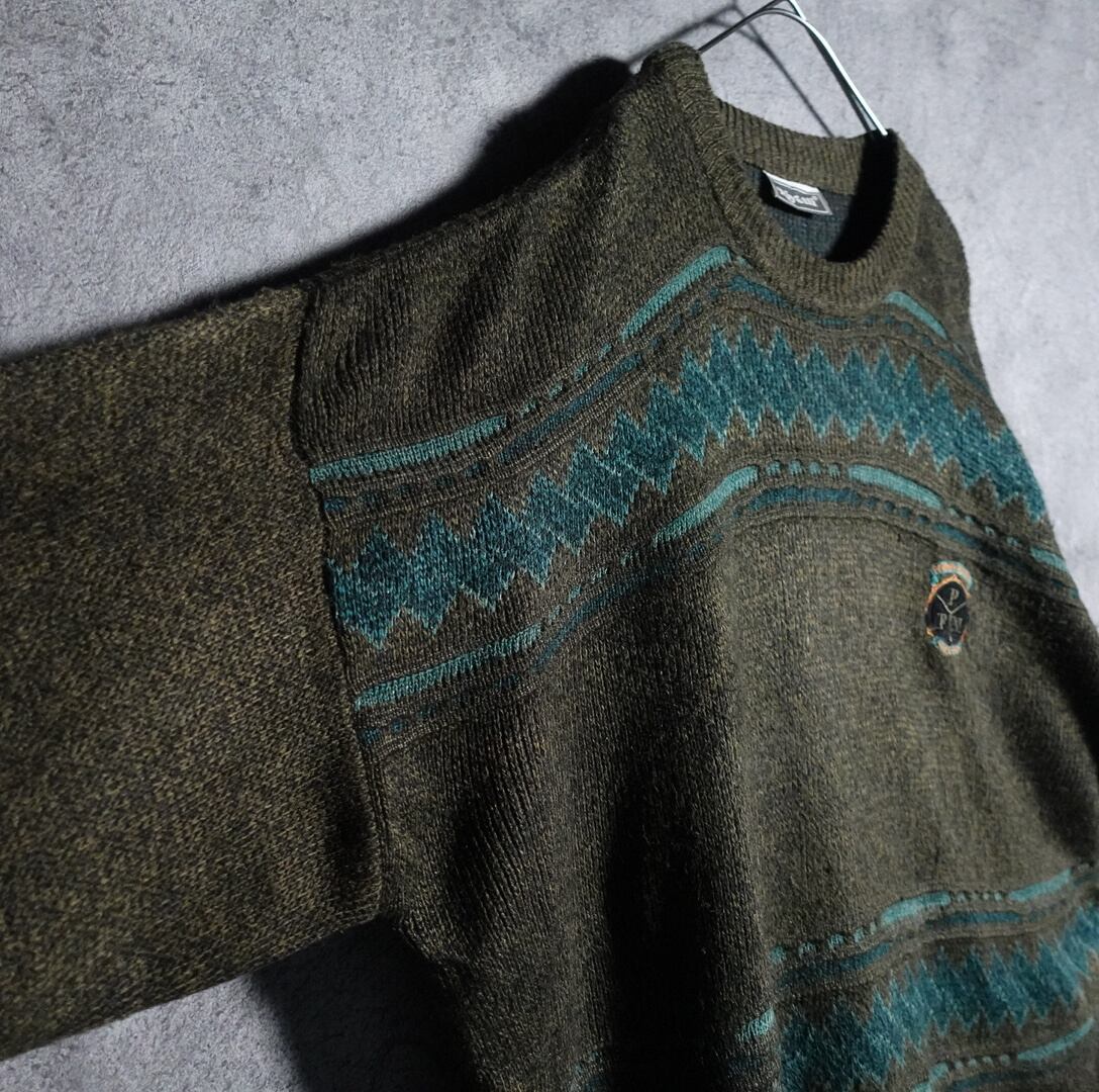 カーキをベースにブルー、ライトブルーの抽象的な柄をあしらい、左胸にロゴ刺繍を施したデザイン。
