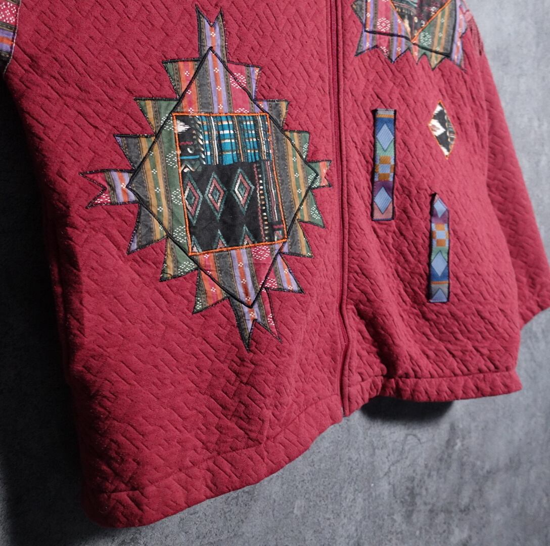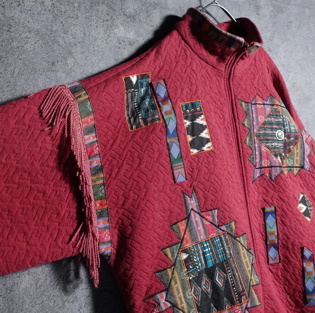 ワインレッドをベースに全面に幾何学模様をあしらい、さらに様々な別生地のネイティブ柄をパッチワーク状に施したデザイン。