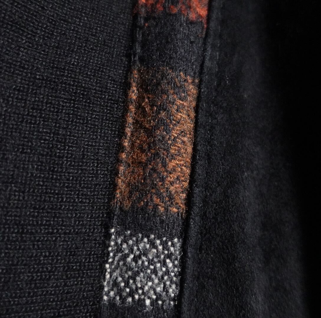 ブラックのスエードレザーをベースに幾何学模様があしらわれたオレンジ、マスタード、ホワイトのニット生地を見頃、裾、袖先に施したスペシャルなデザイン。