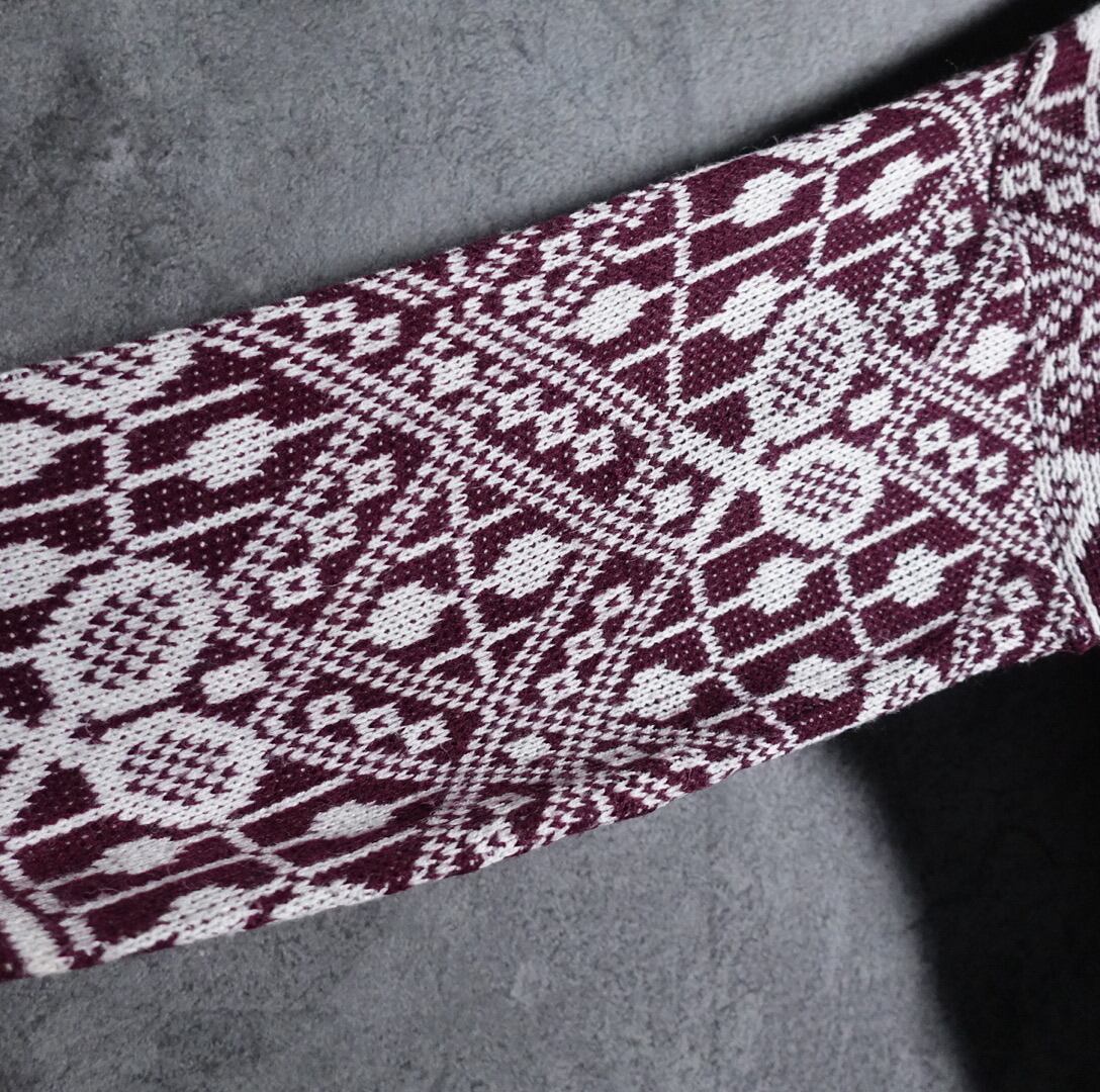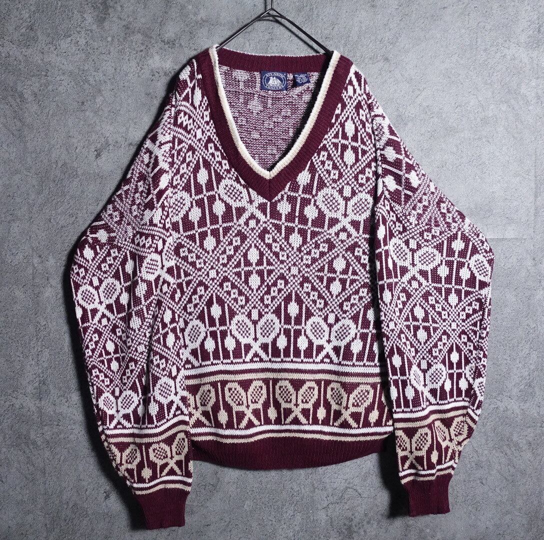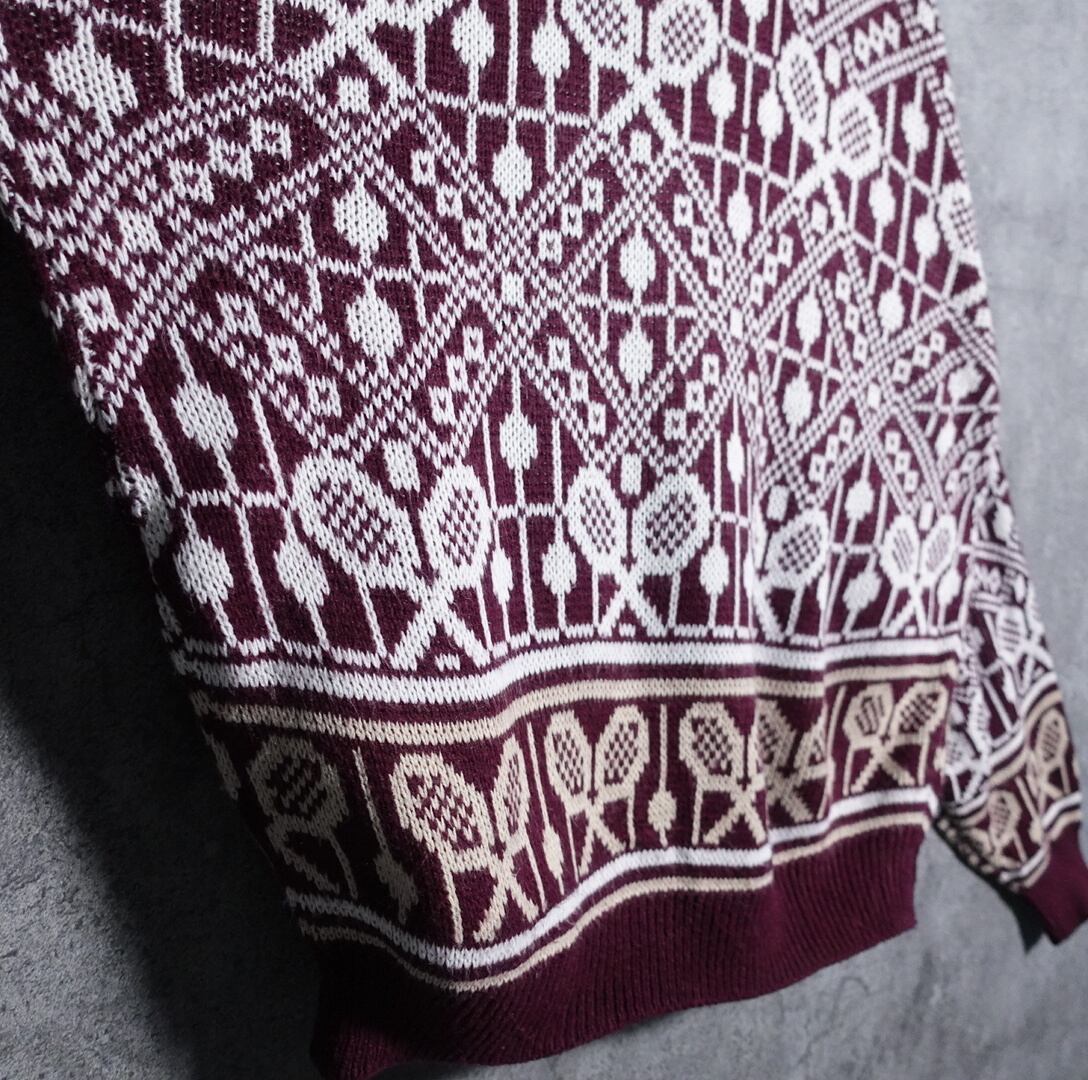 ワインレッド&ホワイトの幾何学柄Vネックデザインニットが入荷です。