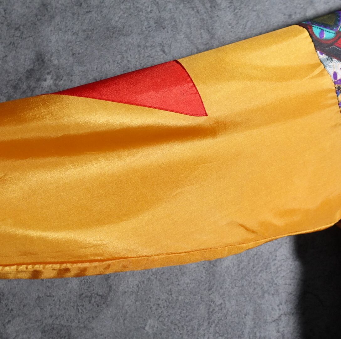 イエローをベースに、右半身、裾、袖にアート調の様々幾何学模様をあしらったアーティスティックなデザイン。