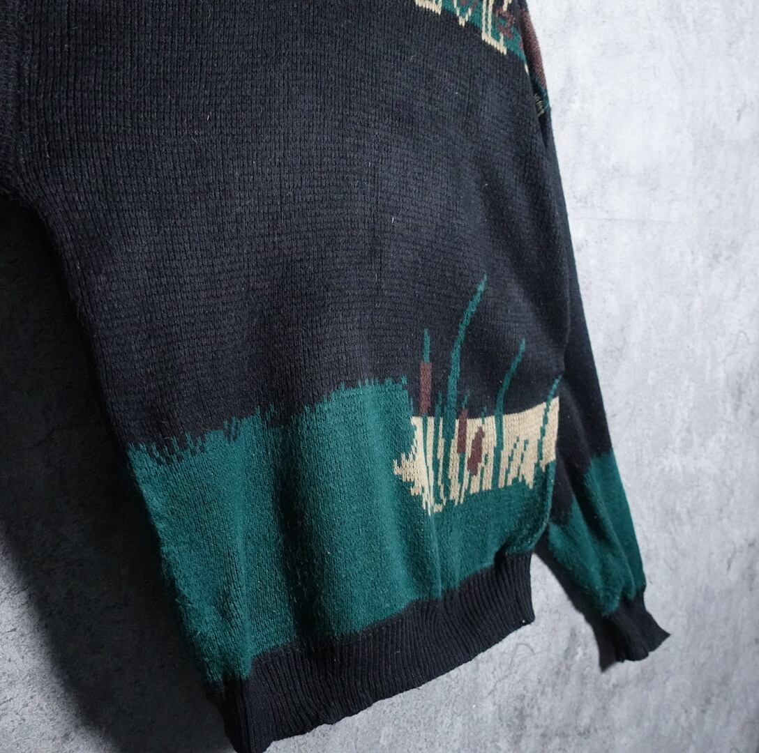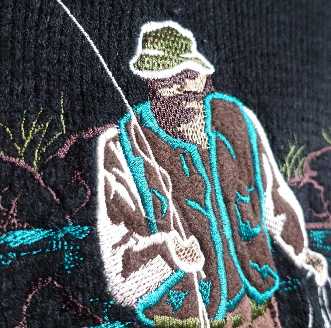 ブラックをベースにブラウン、グリーン、ベージュなどの幾何学模様と、川の中で獲物を探している1人の男性の刺繍を施したデザイン。