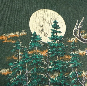 グリーンをベースに夜の森林に佇むシカをあしらったデザイン。