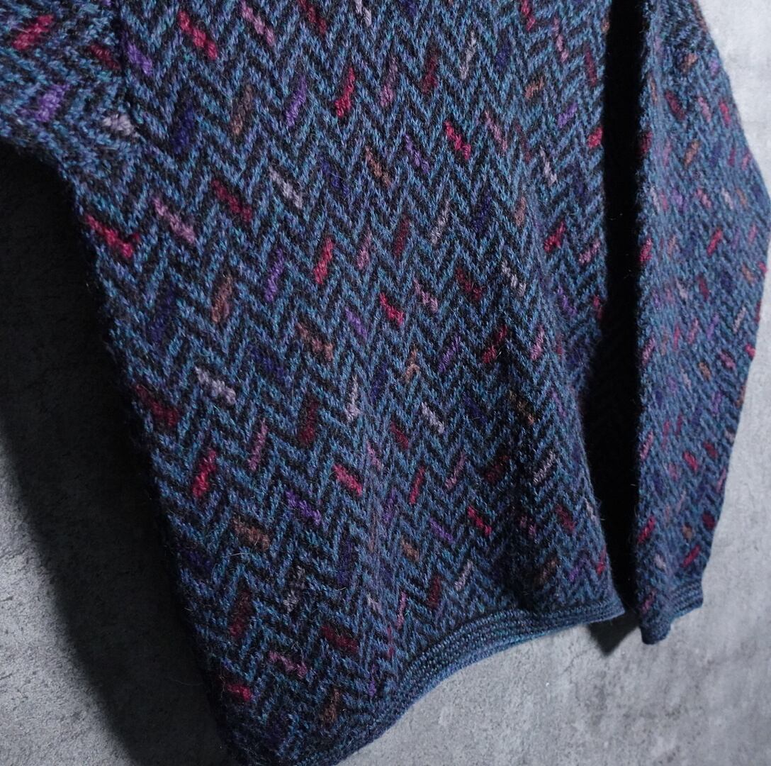 レッド、ブルー、ピンク、パープル、ワインレッドなどの糸を編み込んだジグザグを全面にあしらったデザイン。