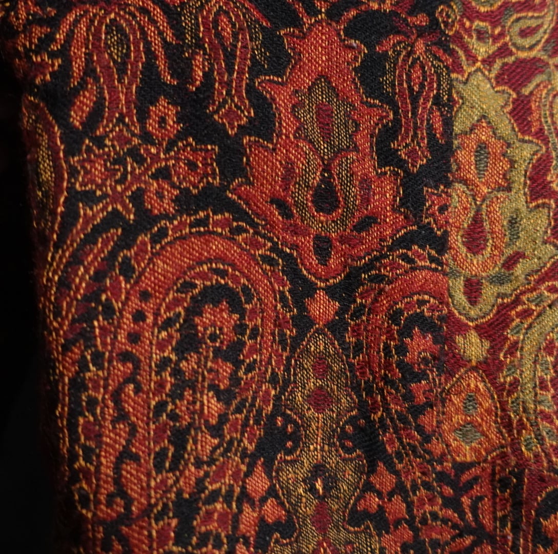ペイズリー、オリエンタル、ボタニカルをプリントではなく織りで表現し、パッチワーク状に縫い合わせて構築された凝りに凝ったスペシャルなデザイン。