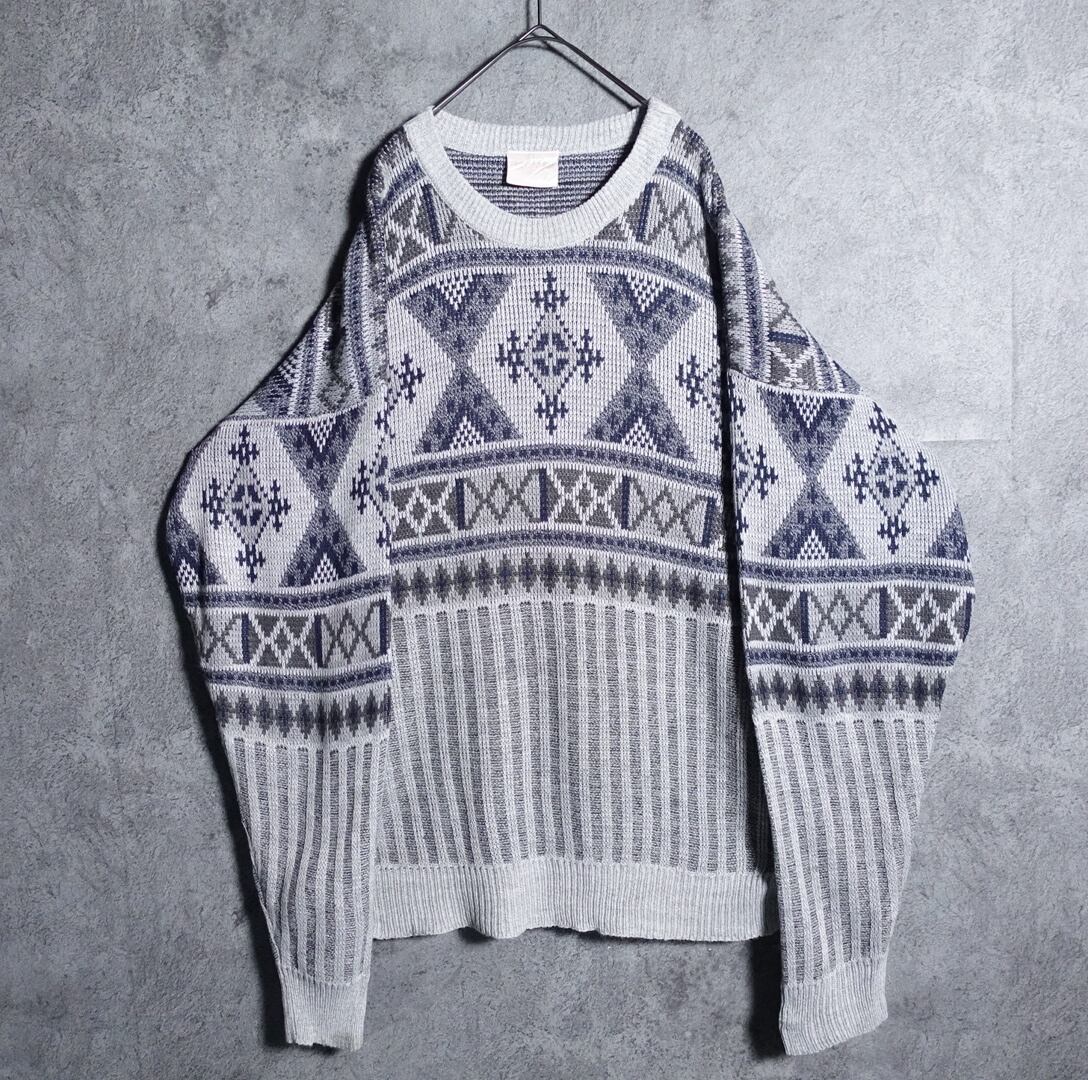 グレーをベースに抽象的な柄とダイヤモチーフを上半分にあしらい、下半分にストライプ状の糸が編み込まれたデザイン。