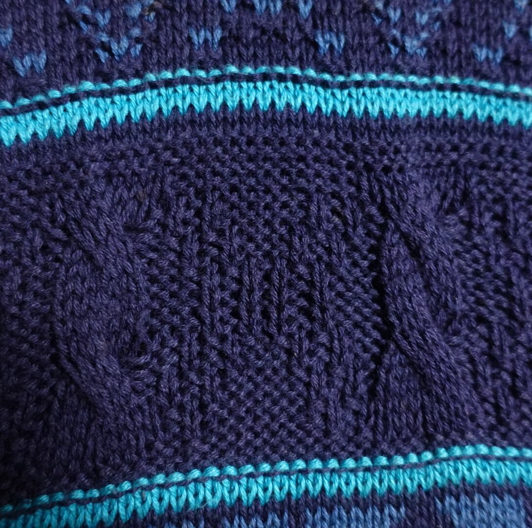 柄との間がローゲージの立体感のある編みになっており、柄はハイゲージなので交互の凸凹でより立体感のある仕上がりとなっています。