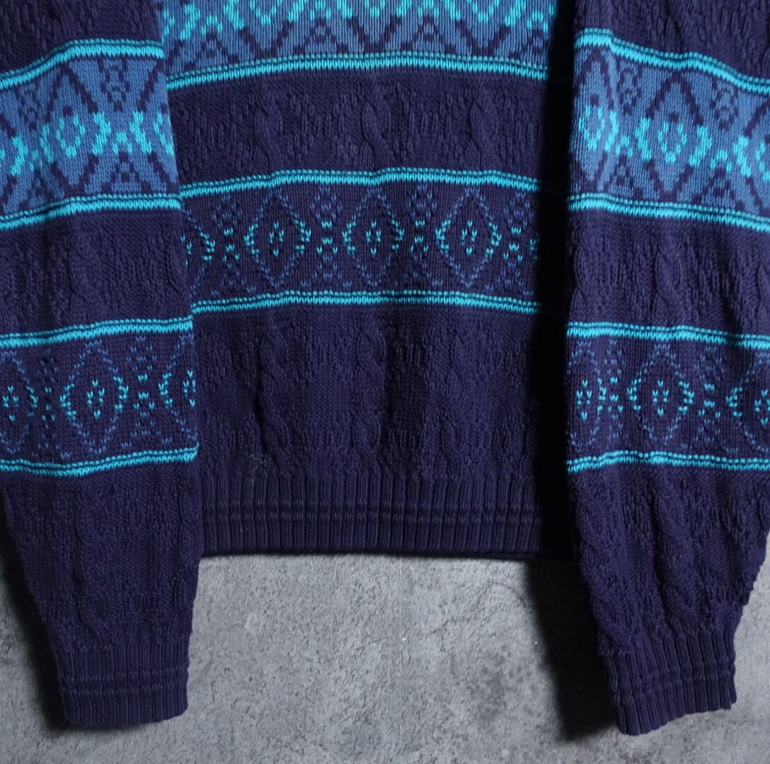ネイビーをベースにライトブルー、ブルーの幾何学模様をボーダー状に全面にあしらったデザイン。