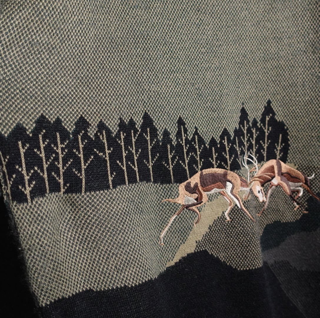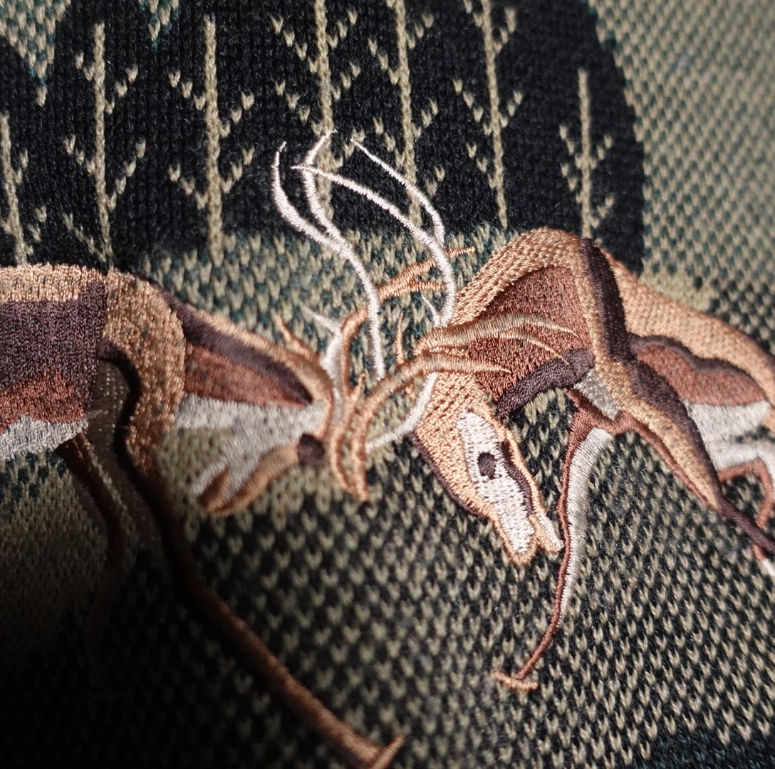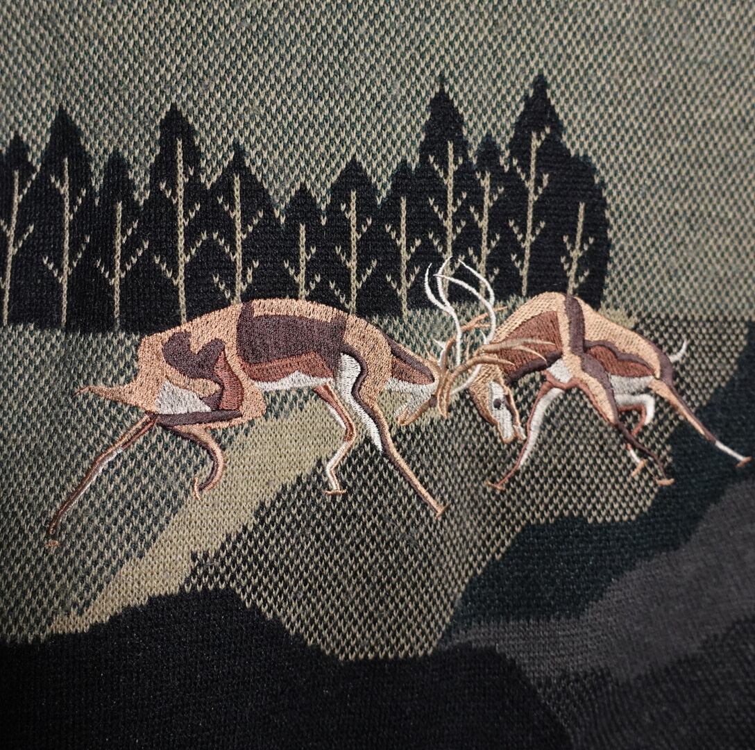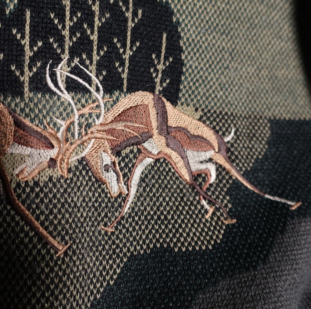 ブラックをベースに森林で2頭のシカがツノをぶつけあう様子を表現し全面にあしらったアーティスティックなデザイン。