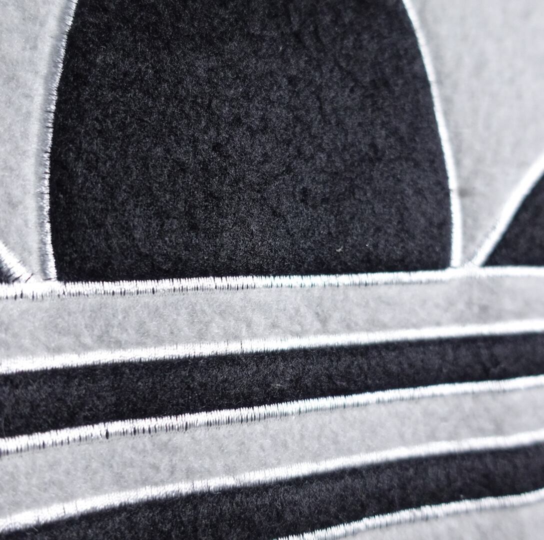 ライトグレーをベースにブラックのトレフォイルロゴとadidasのロゴを大きく施したデザイン。