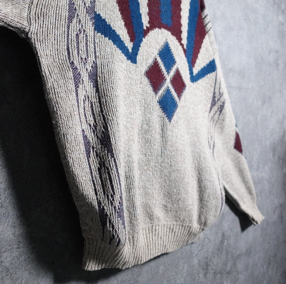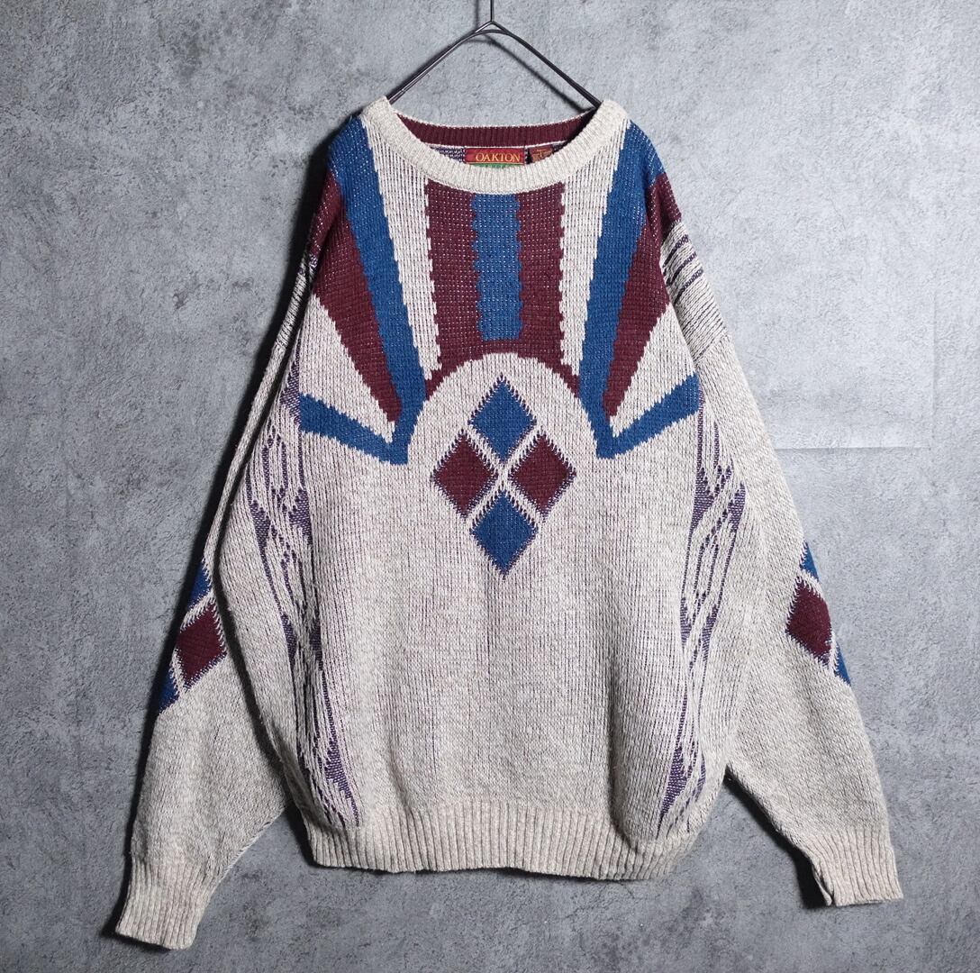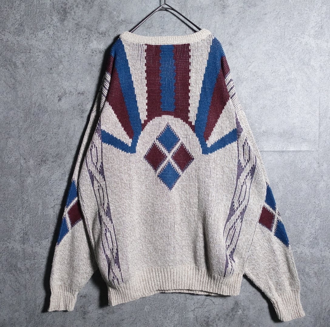 ベージュをベースに、ワインレッドとブルーのダイヤモチーフを両面の中心部分と、両袖にあしらったデザイン。